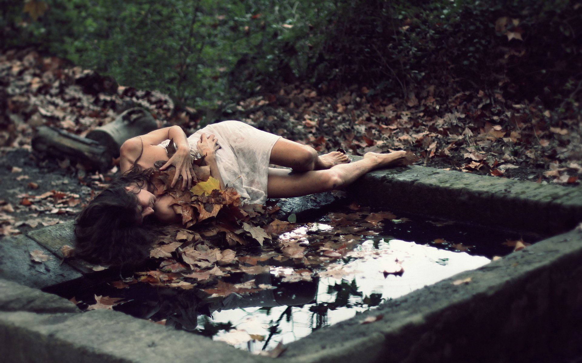 Dziewczyna na asfalcie usianym liśćmi - tapety na pulpit