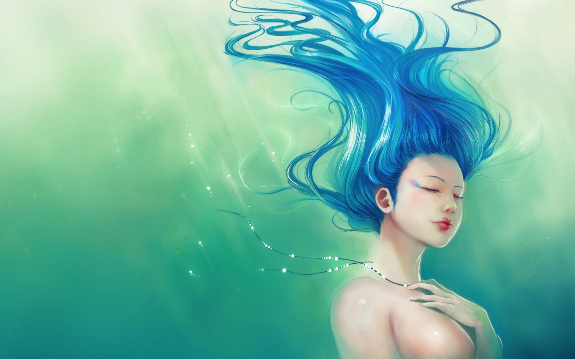 Dziewczyna z niebieskimi włosami na zielonym tle - tapety na pulpit