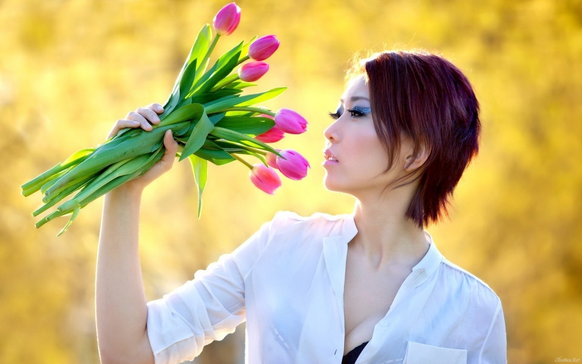Krótkowłosa brunetka z bukietem tulipanów - tapety na pulpit