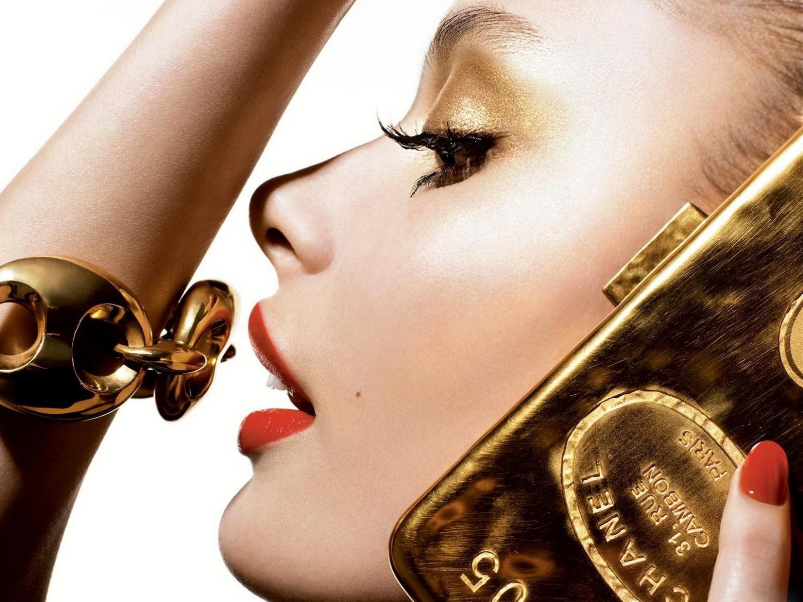 Seksowna dziewczyna ze złotem i czerwoną szminką - tapety na telefon