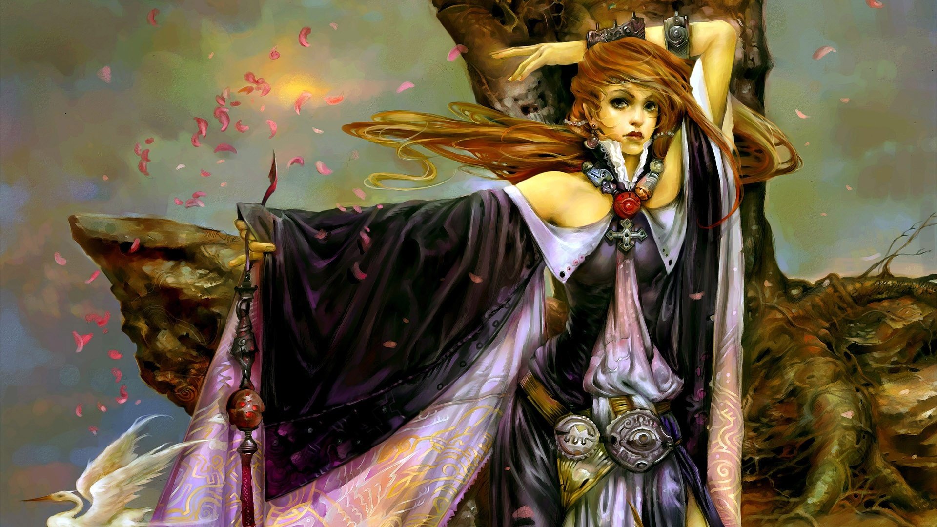 Dziewczyna z laską otoczoną latającymi płatkami - tapety na pulpit