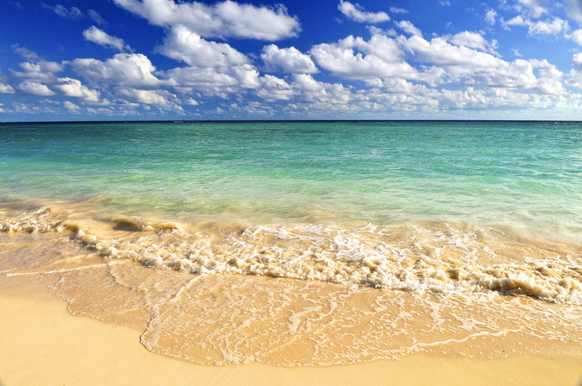 Piaszczysta plaża z niebieskimi falami i pięknymi chmurami - tapety na pulpit