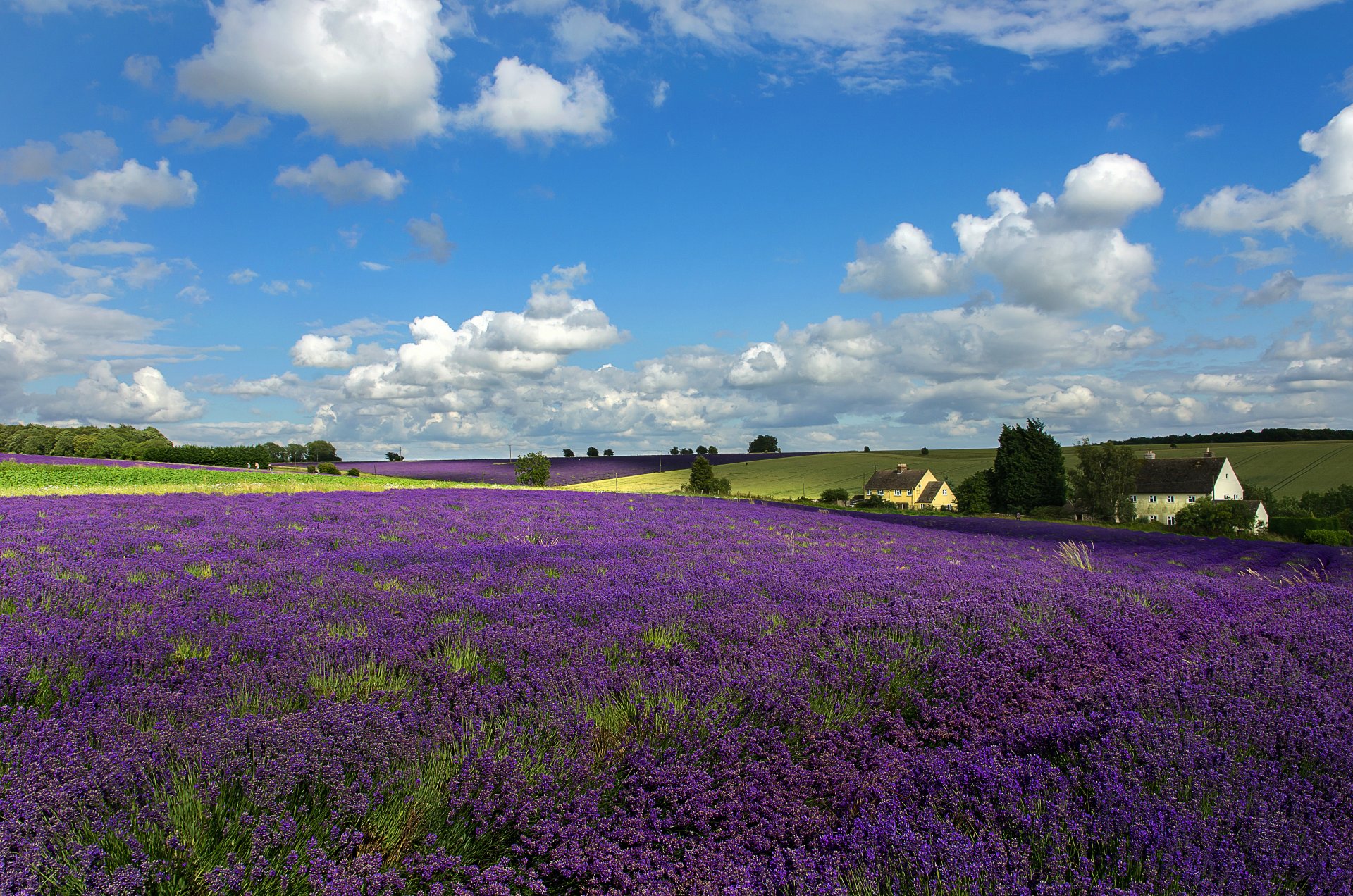 Tagi:niebo, chmury, wzgórza, pole, łąka, kwiaty, drzewa, dom