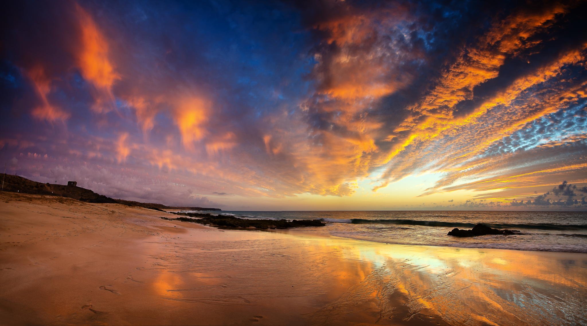 Tagi:zachód słońca, plaża, skały, ocean, piasek