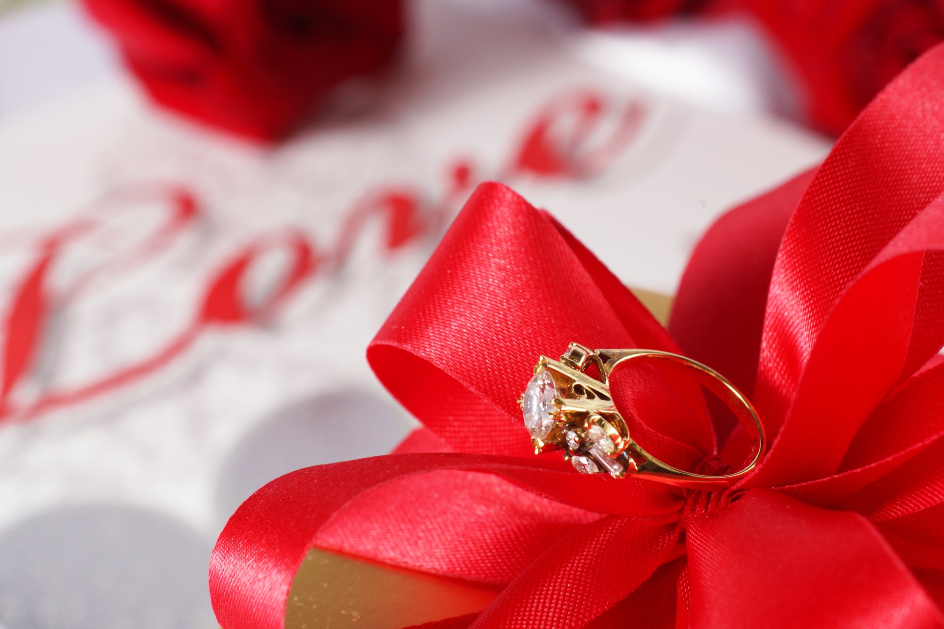Masywny pierścionek z kamieniem na czerwonej kokardce - tapety na telefon