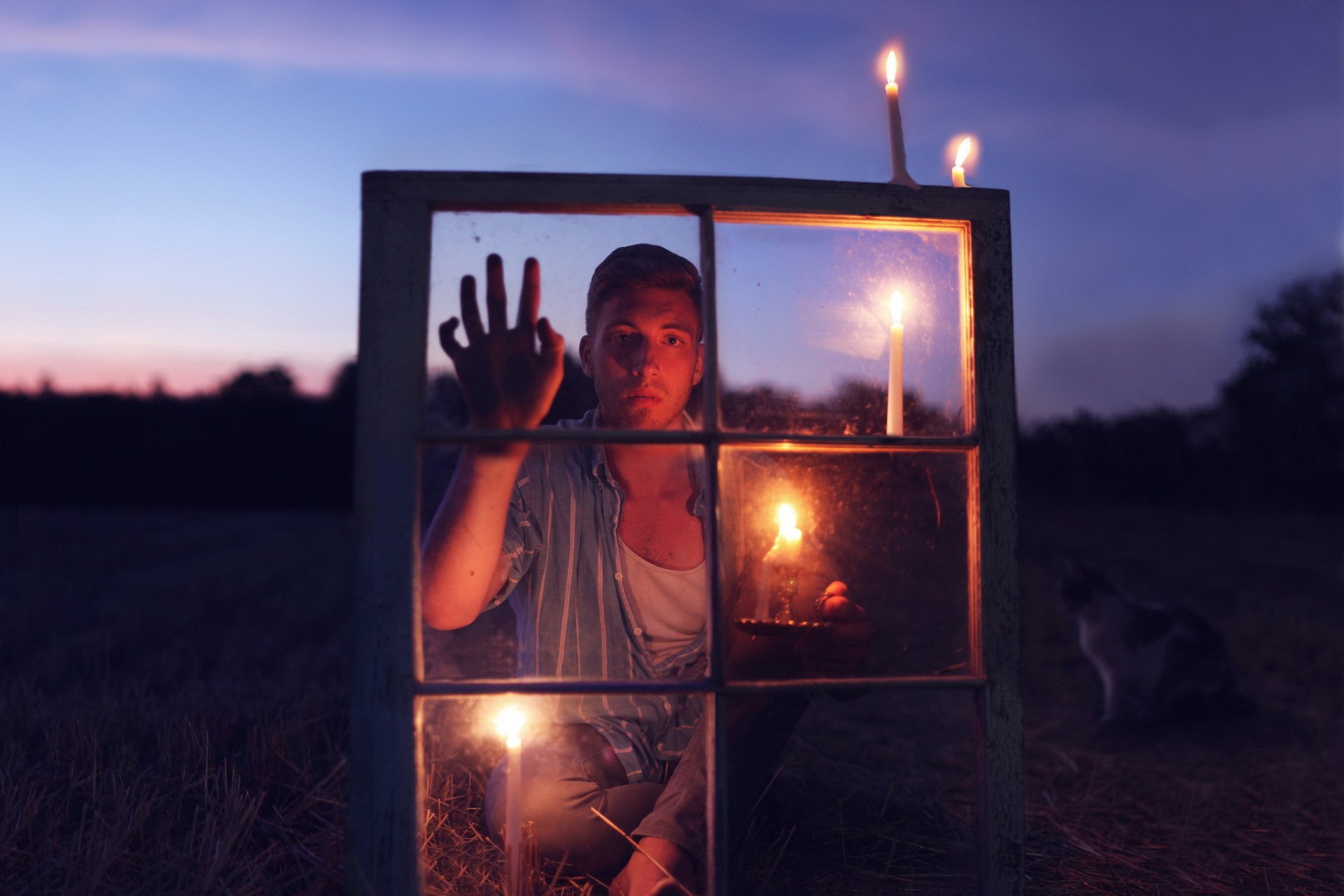 Facet ze świecą patrzy przez okno - tapety na telefon