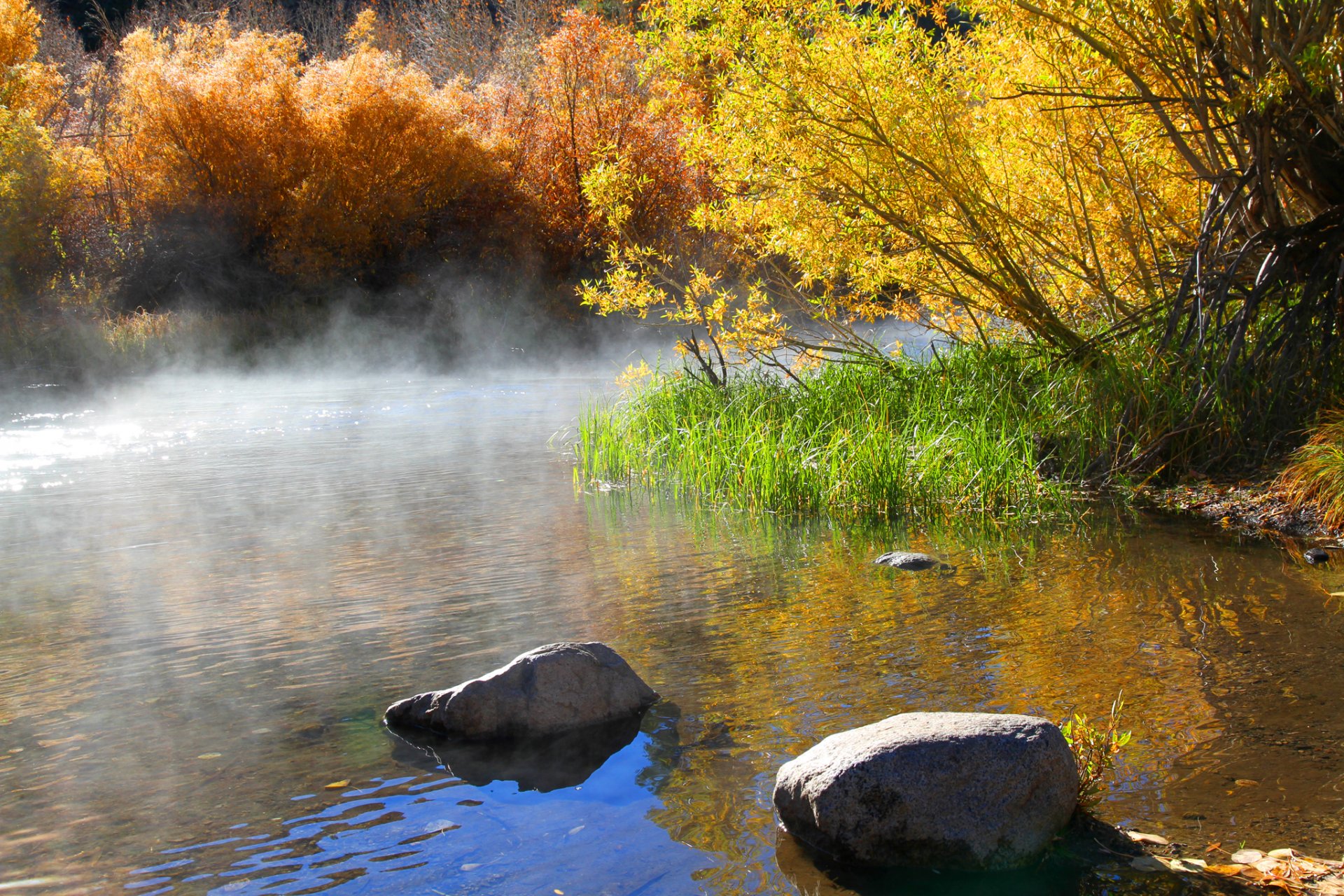 Tagi:jezioro, poranek, mgła, drzewa, krzewy, kamienie, jesień
