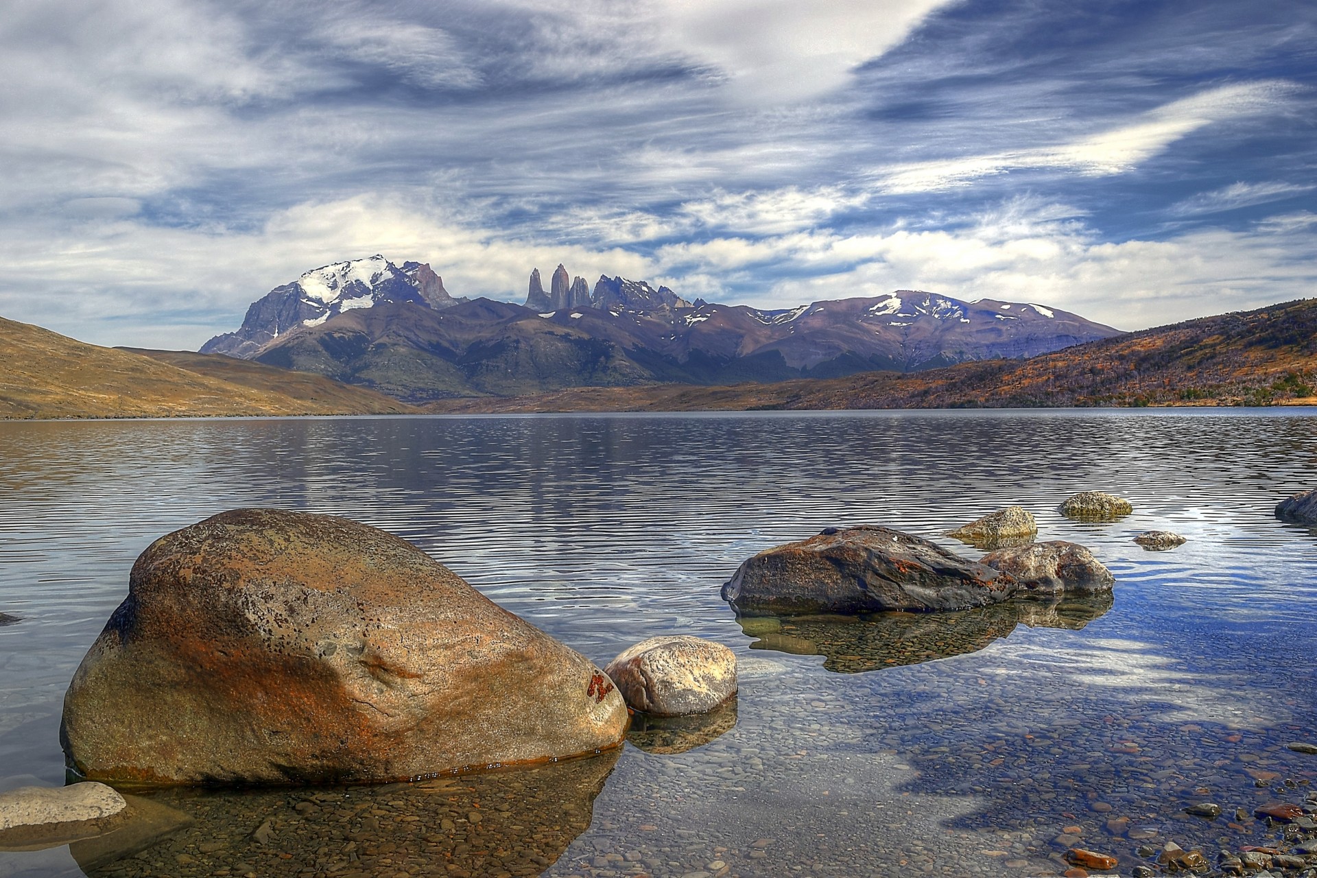 Kamienie w wodzie a w górach śnieg - tapety na pulpit