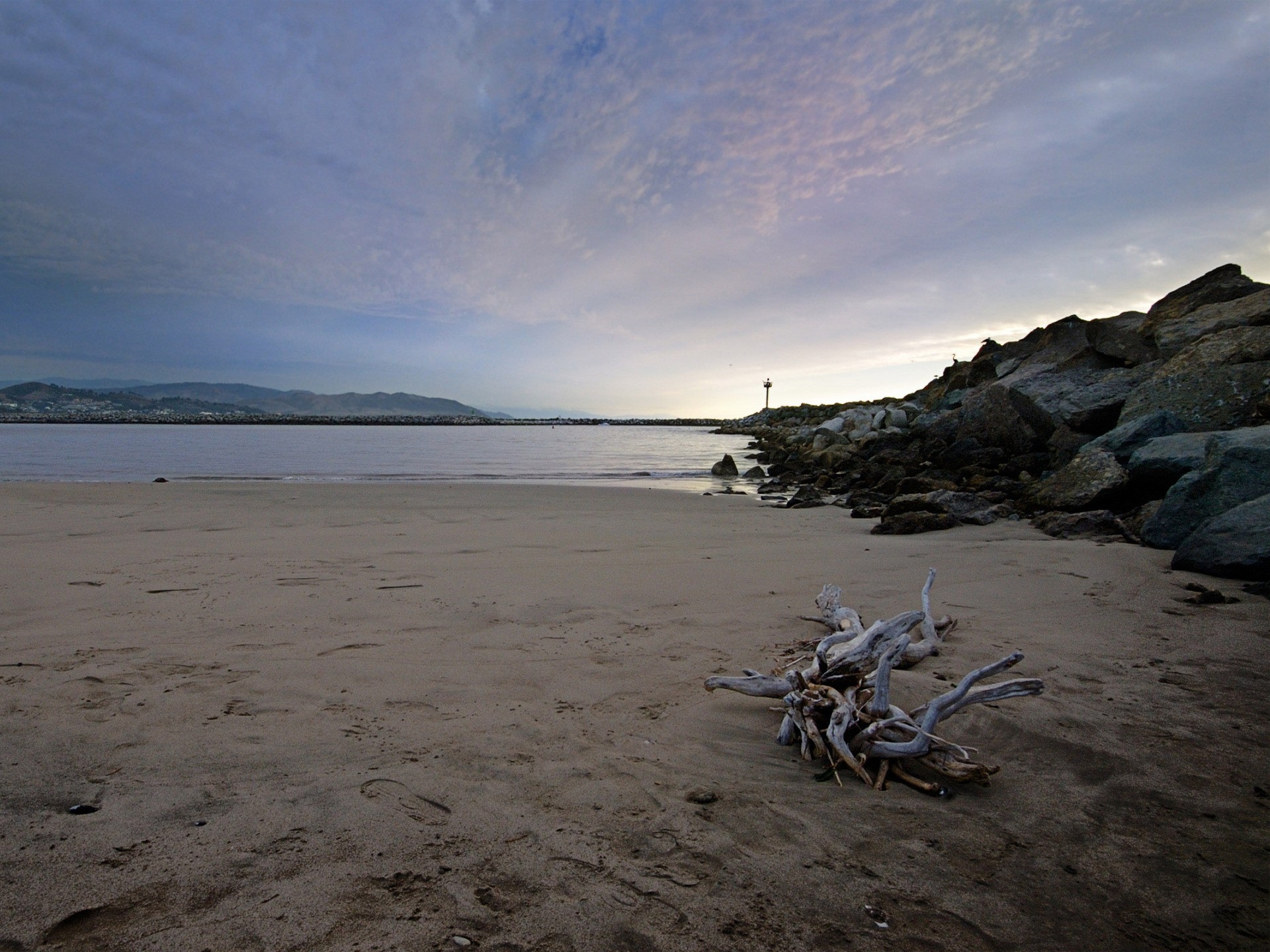 Zachód słońca na bezludnej skalistej plaży - tapety na pulpit