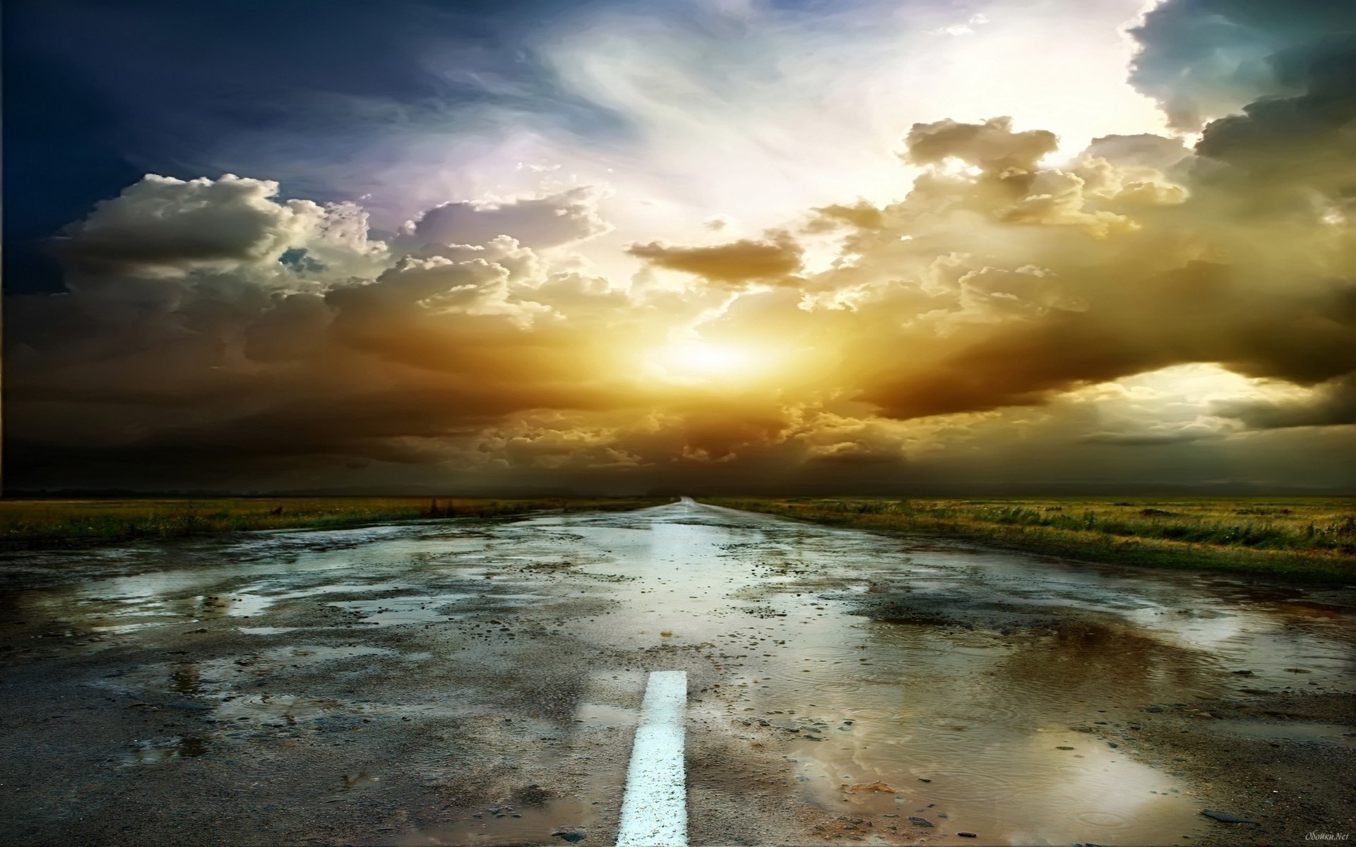 Droga z kałużami o zachodzie słońca i odbiciem obraków