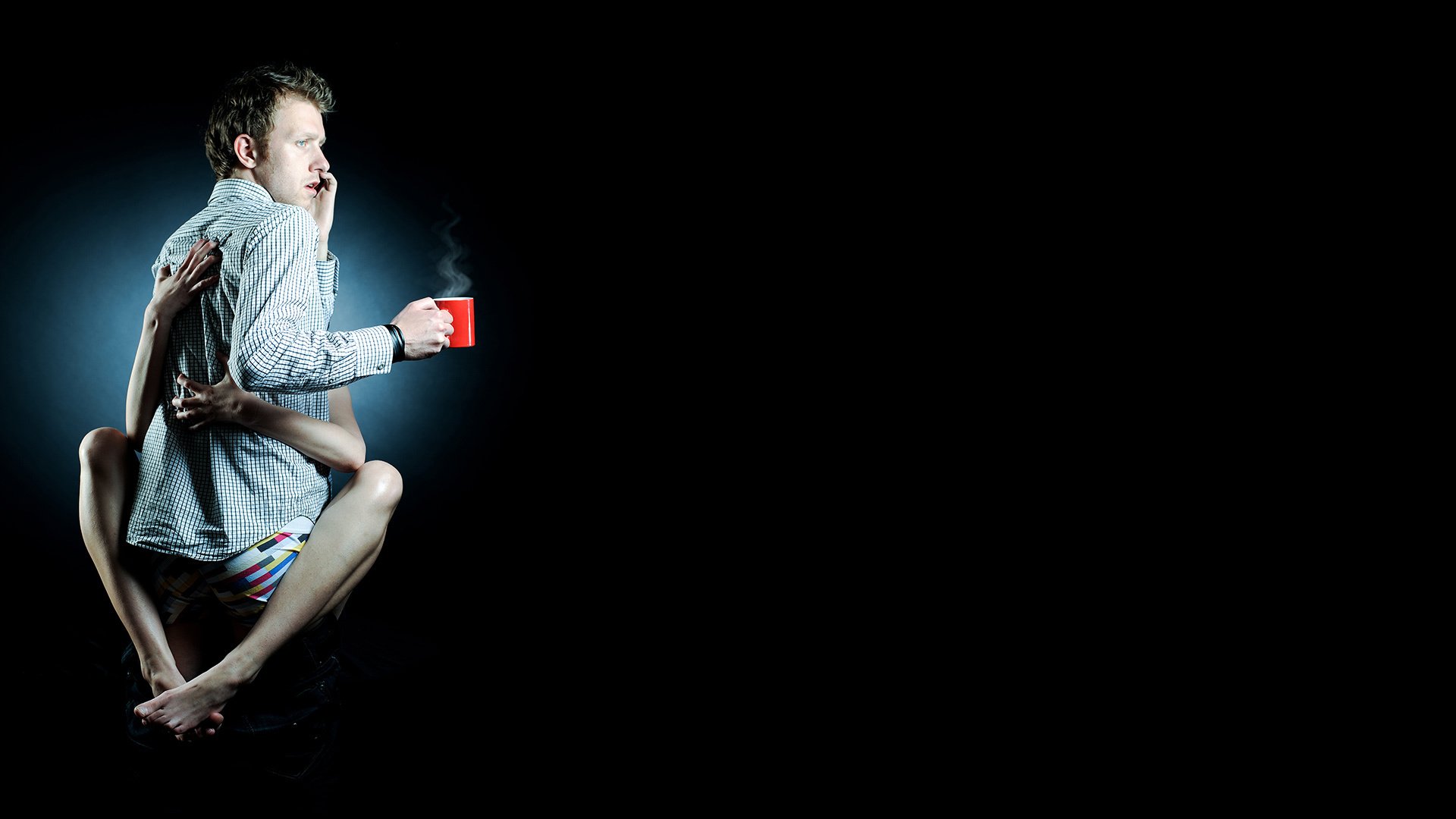 Mężczyzna z telefonem i kawą w ramionach kobiety