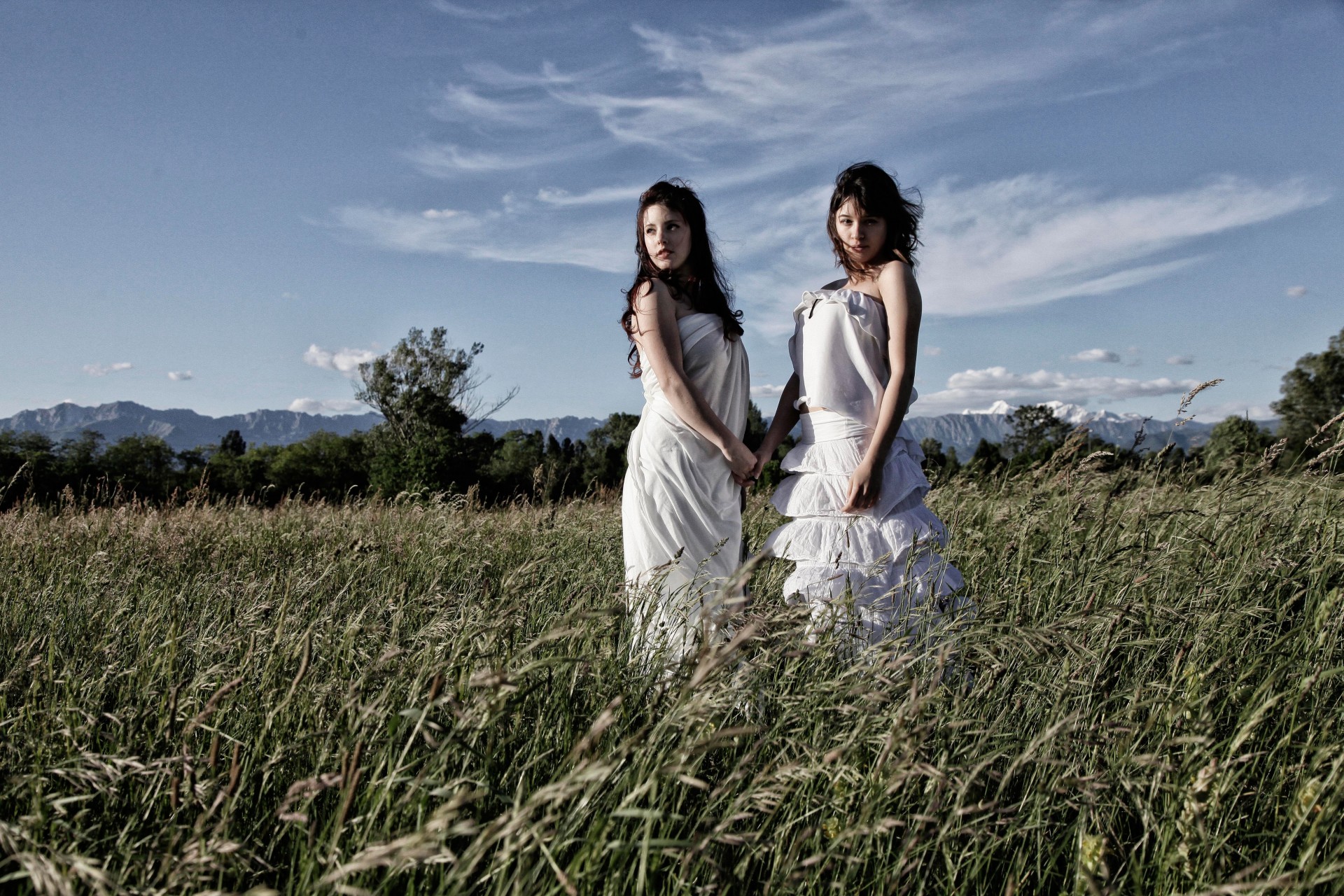 Kontrastowe zdjęcie. dziewczyny w kolorowych sukienkach