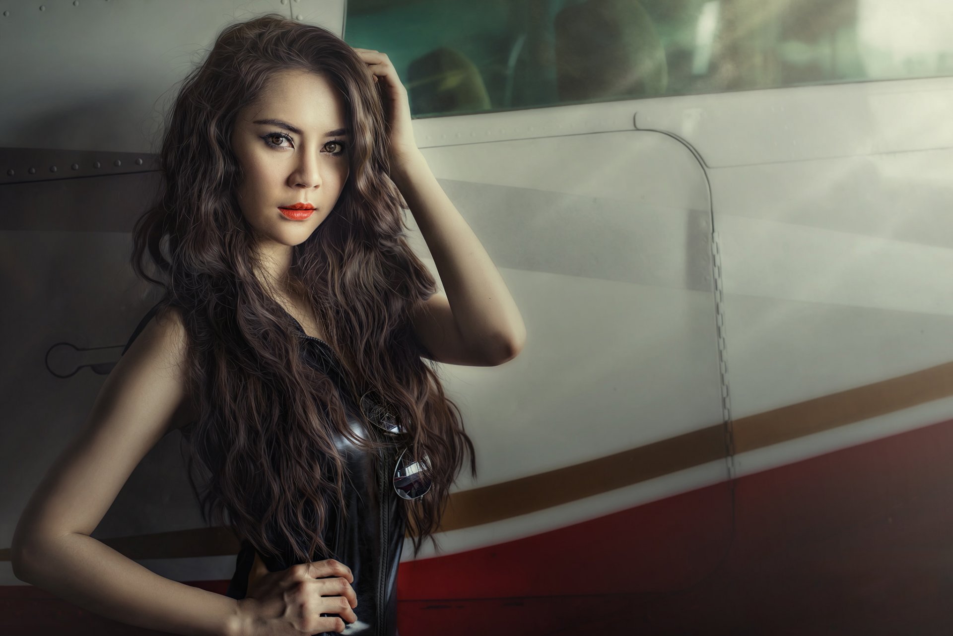 Widok azjatyckiej dziewczyny w pobliżu samolotu