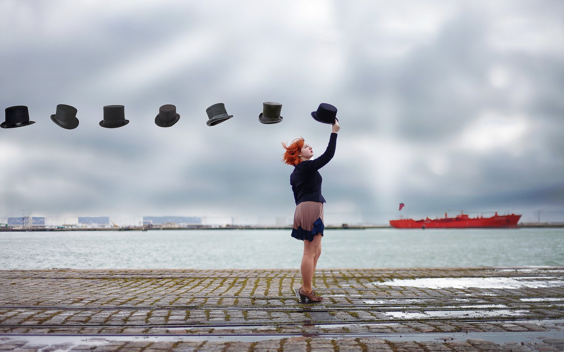 Dziewczyna z kapeluszami na molo