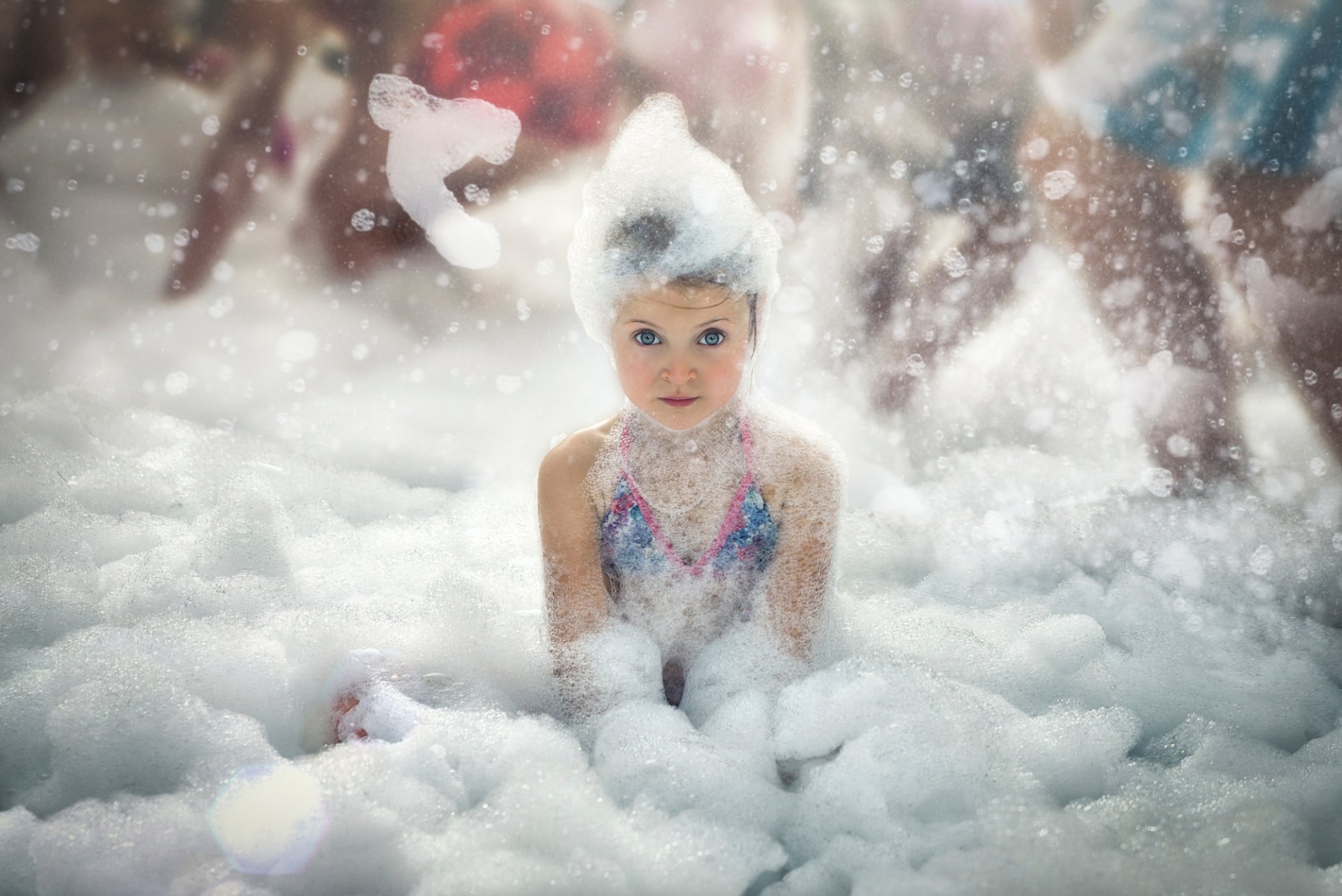 Dziewczyna bawi się na piankowej imprezie - tapety na telefon