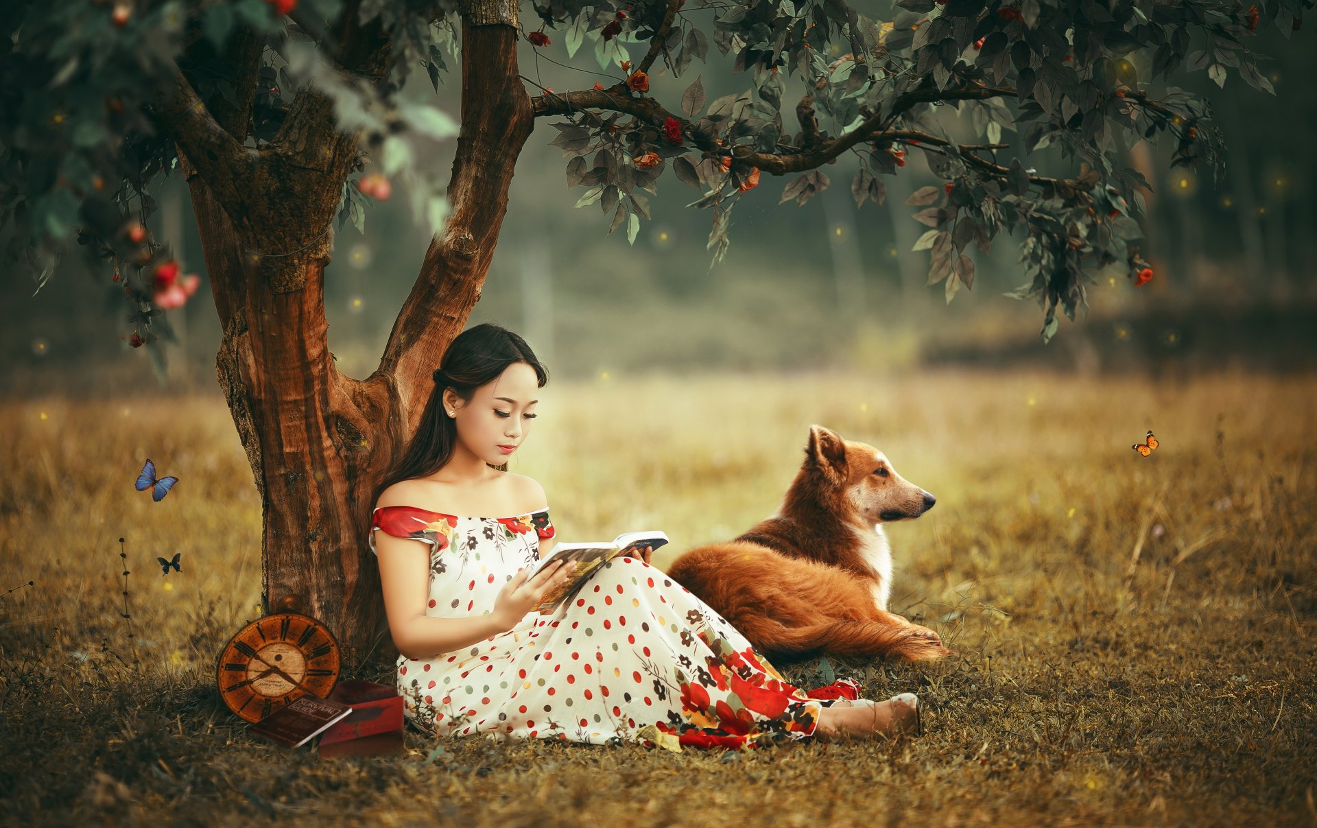 Azjatka z lisem koło drzewa