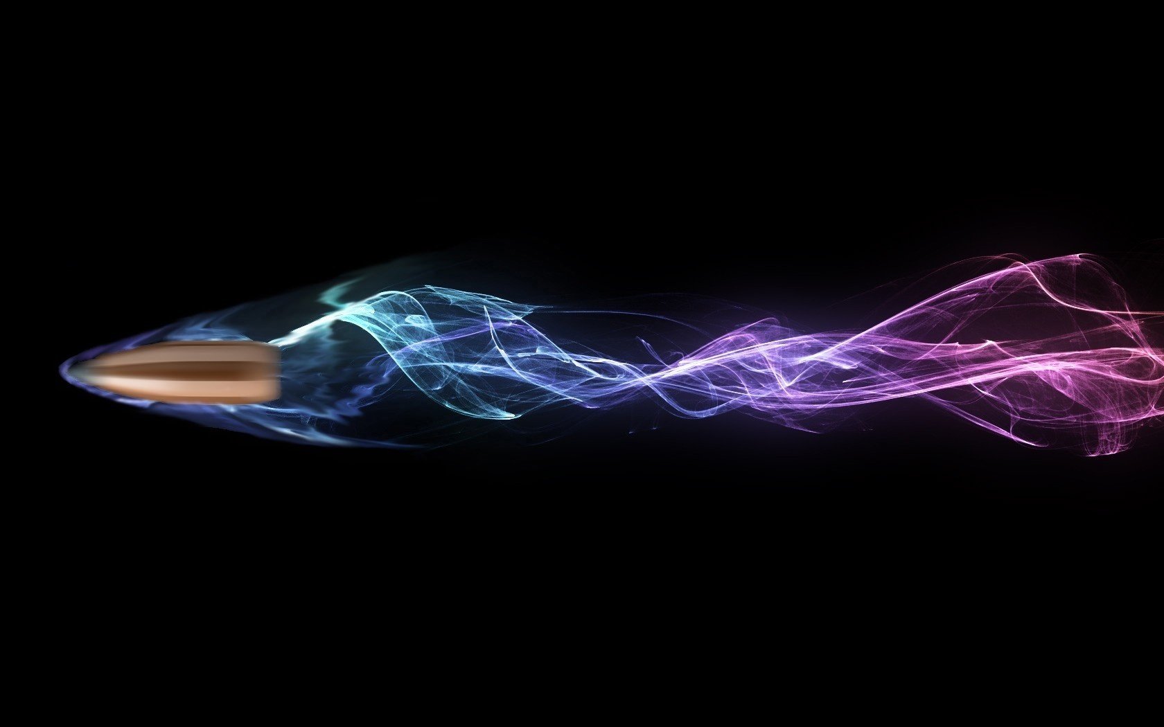 Na czarnym tle Latająca kula z wielokolorowym śladem