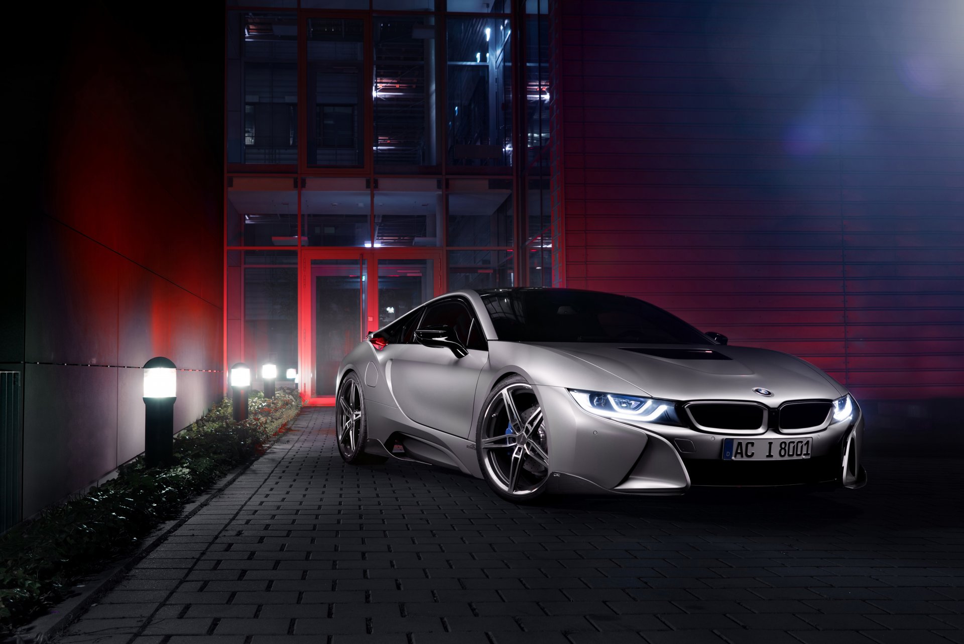 BMW i8 w kolorze szarym na tle budynku z Czerwonym podświetleniem