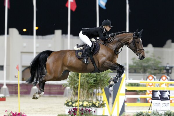 Czekoladowy ogier z kowbojką z wdziękiem przeskakuje barieręCzekoladowy ogier z kowbojką z wdziękiem przeskakuje barierę