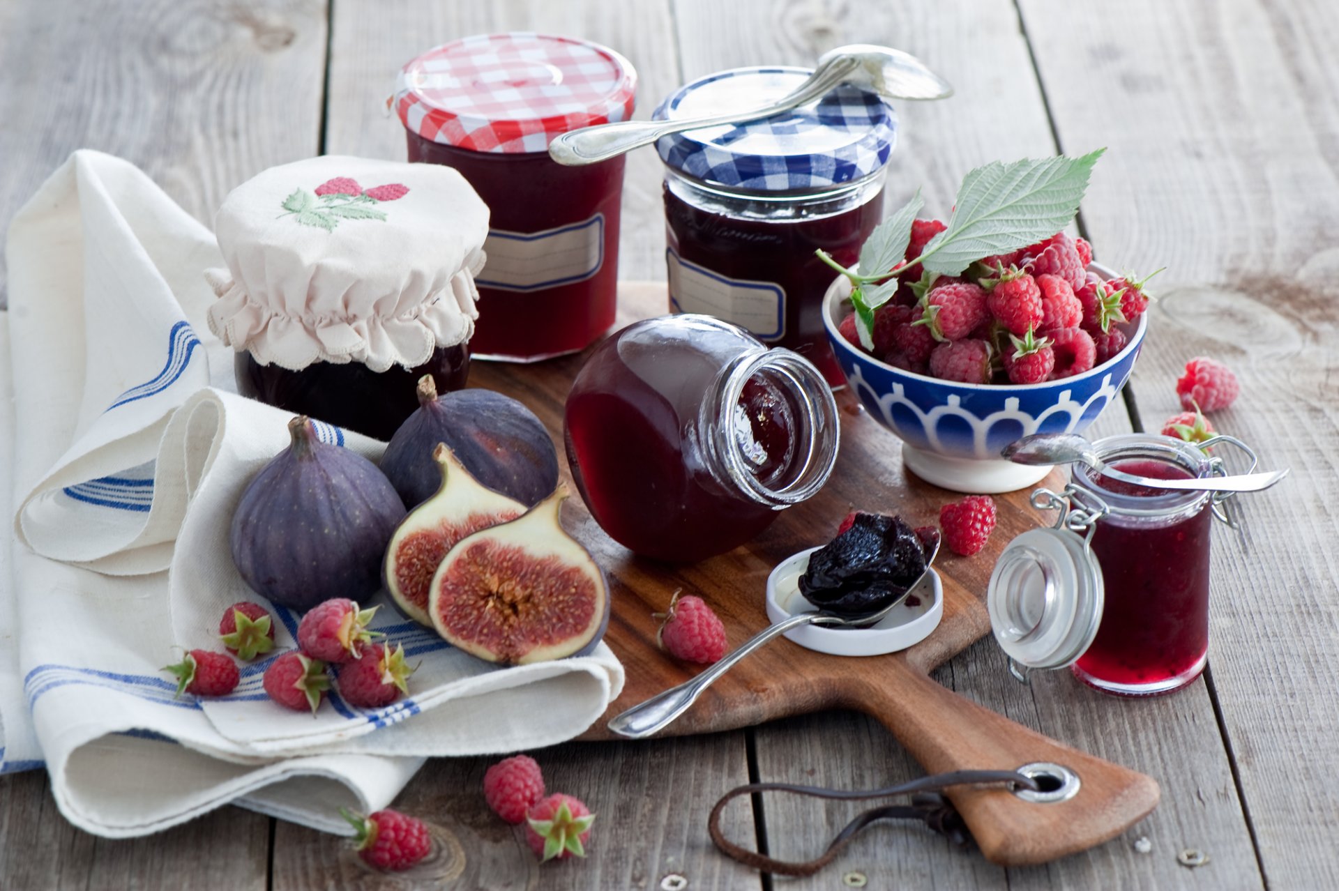 Figi w koszu obok słoika z dżemem na drewnianej desce