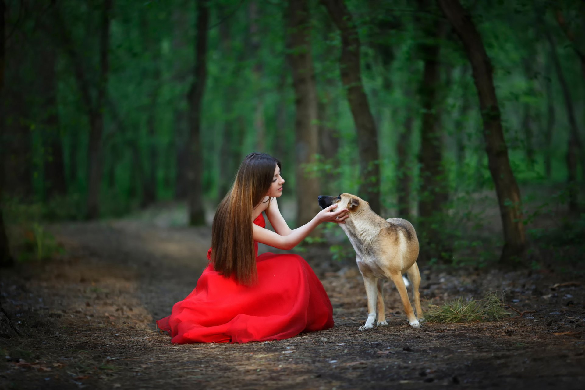 Dziewczyna w czerwonej sukience, z psem. proogulka w lesieDziewczyna w czerwonej sukience, z psem. Proogulka w lesie
