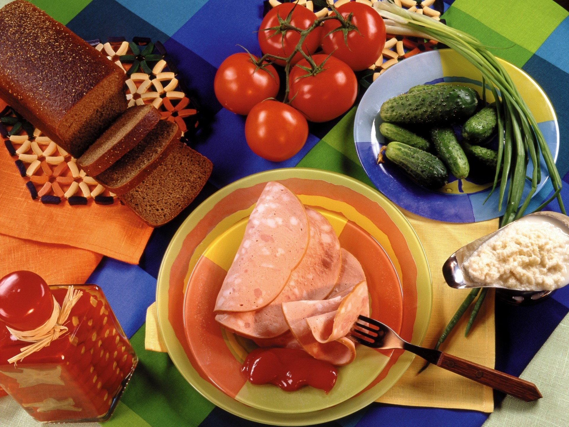 Kanapka z kiełbasą z sałatką pomidorową. Zdjęcie apetytu