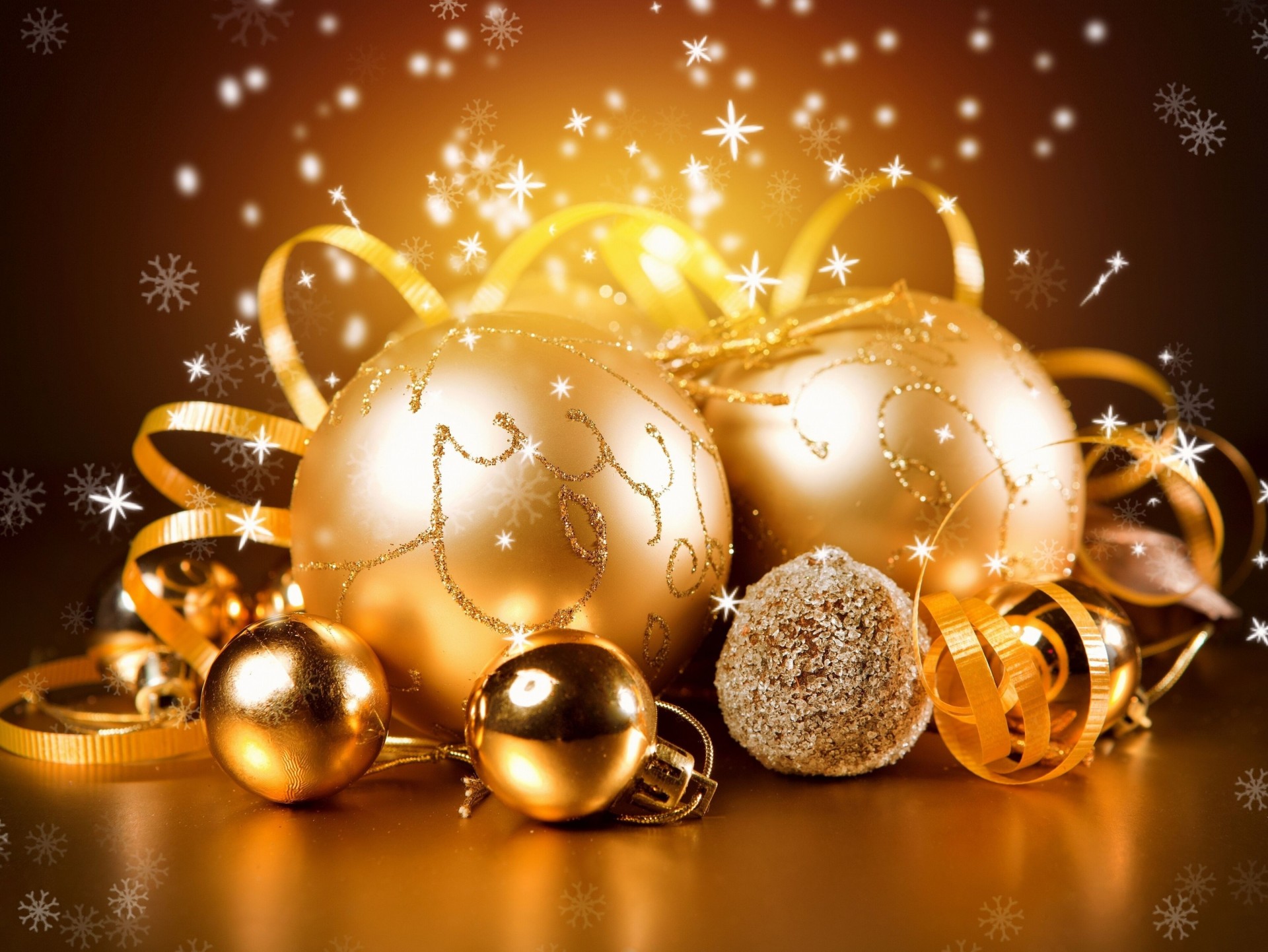 Noworoczne zabawki w postaci figurek zwierząt w kolorze złotym u góry, w środku białe tło, u góry iu dołu na niebieskim tle białe płatki śniegu