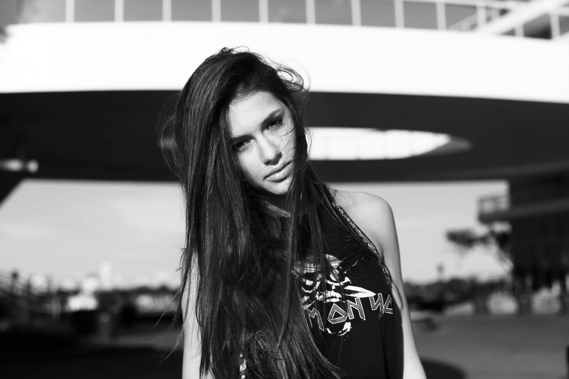 Młoda brunetka z poważną twarzą pozuje z boku kadru w czerni i bieliMłoda brunetka z poważną twarzą pozuje z boku kadru w czerni i bieli