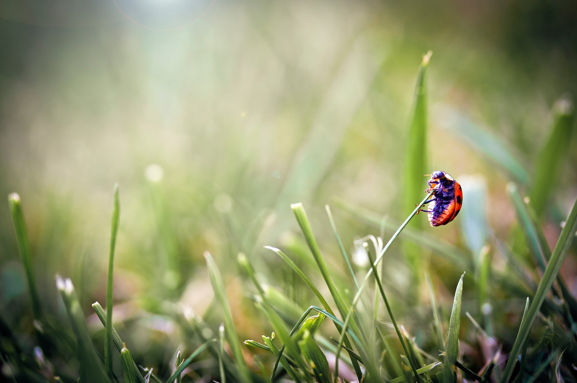 Biedronka wczołgała się na trawkę i próbuje wystartować