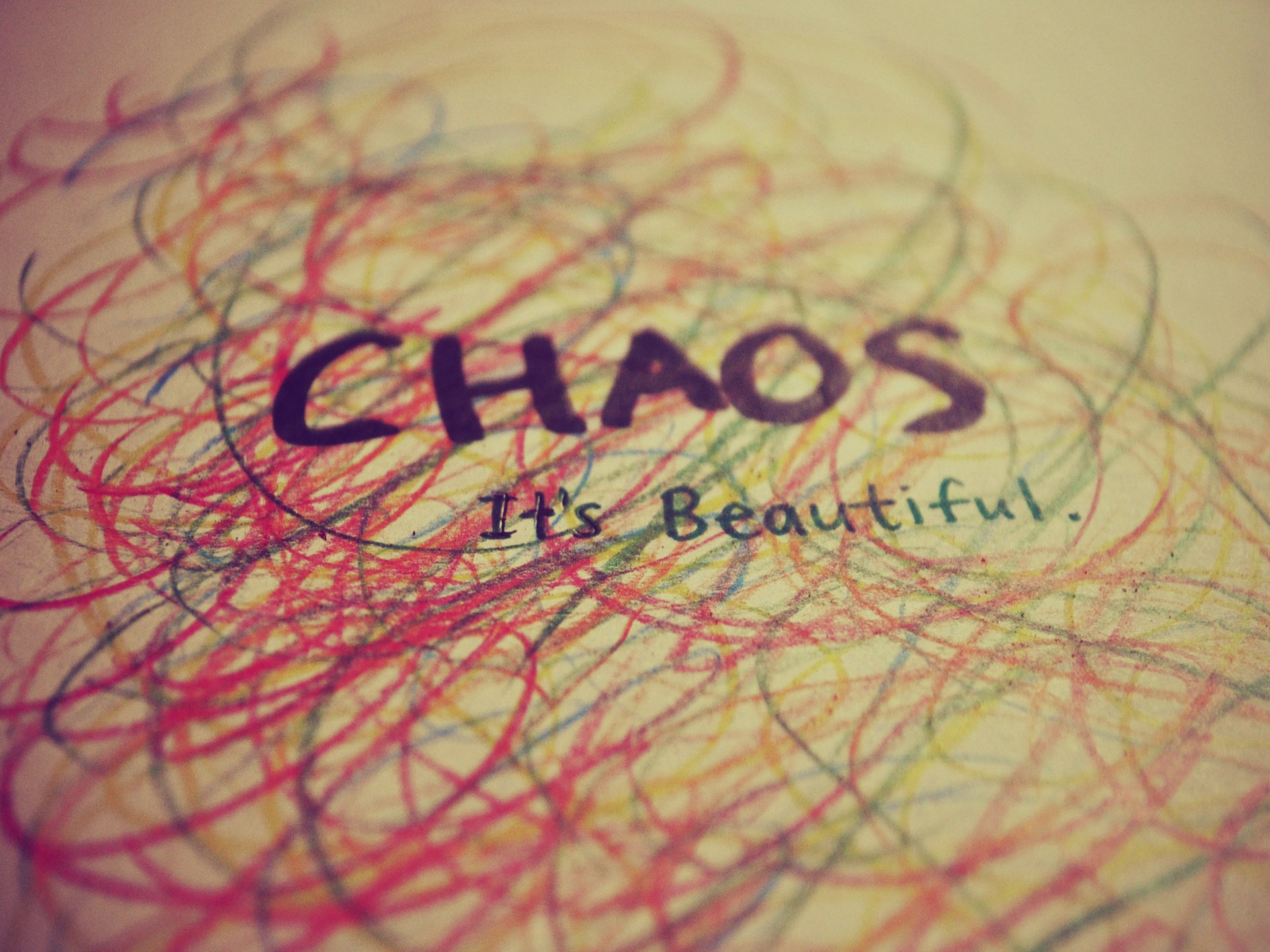 Napis " Chaos. It 's beautiful" wśród kolorowych linii