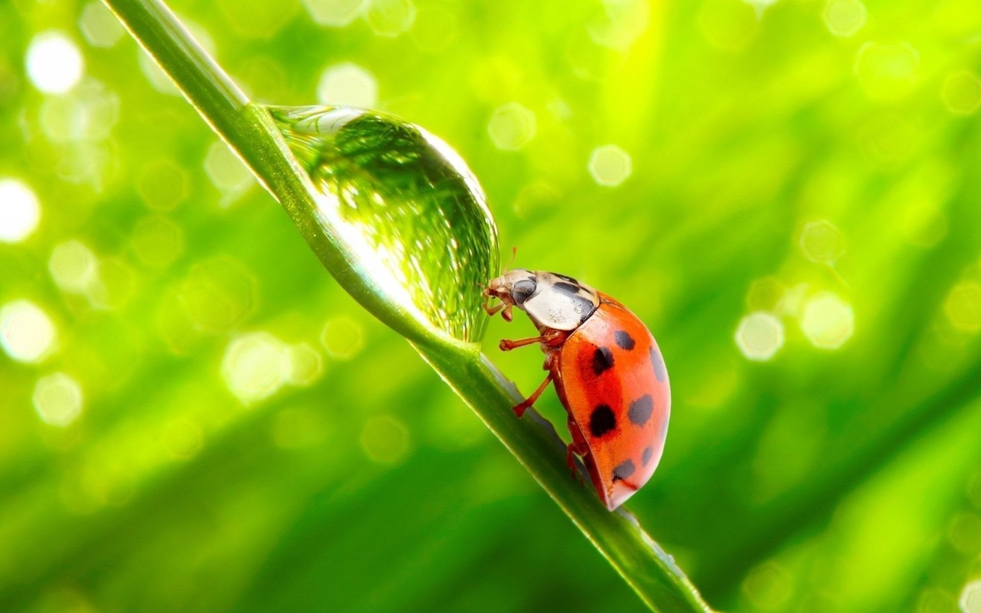 Przygotowanie do lotu. Biedronka na źdźble trawy. Pamięć o deszczu