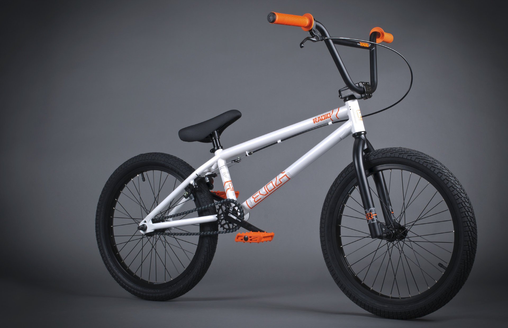 Biały z pomarańczowymi uchwytami rower bmx na szarym tleBiały z pomarańczowymi uchwytami rower bmx na szarym tle