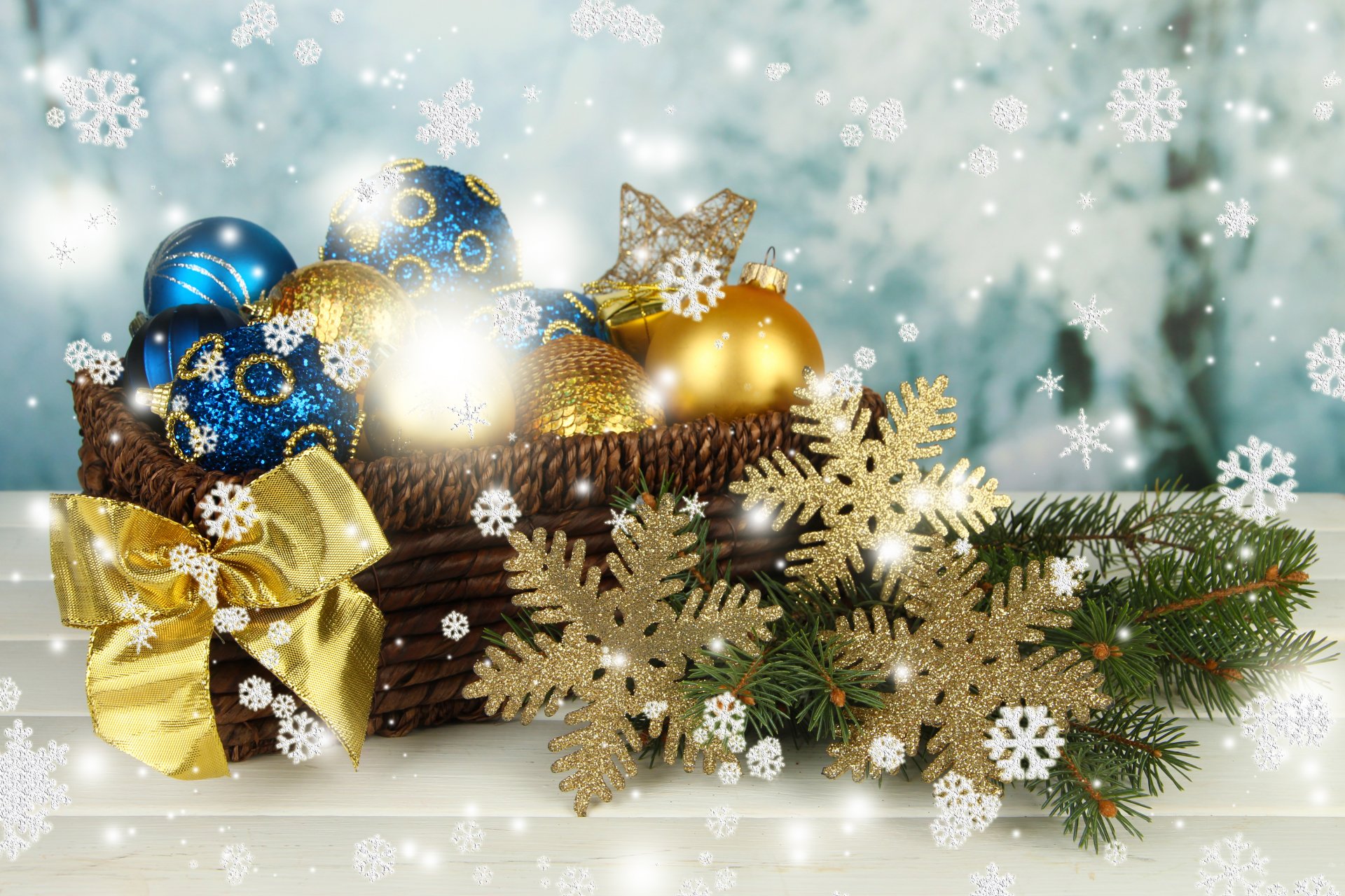 Złote i niebieskie ozdoby choinkowe w koszu