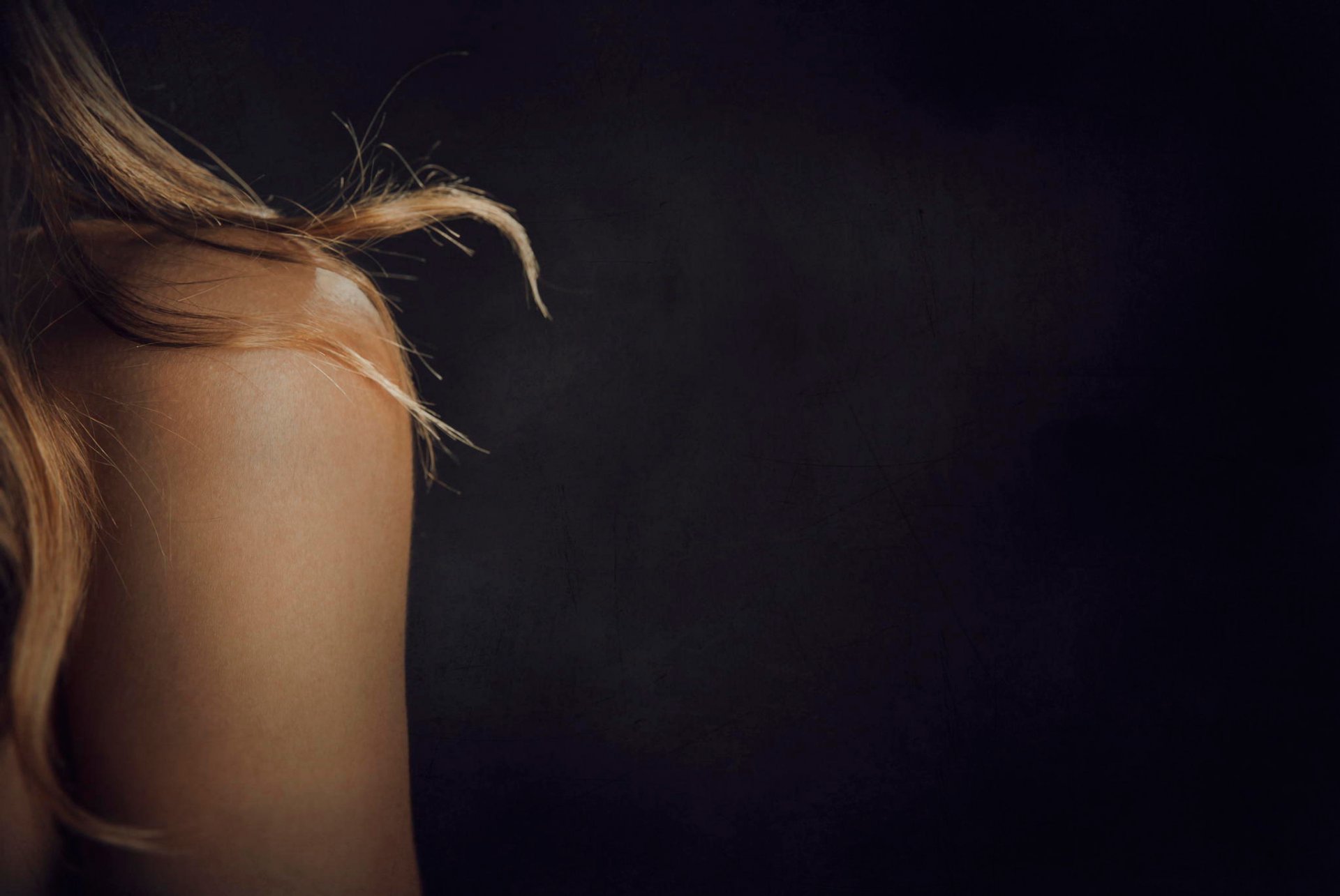 Blond loki na ramieniu młodej dziewczyny. ciemne tłoBlond loki na ramieniu młodej dziewczyny. Ciemne tło