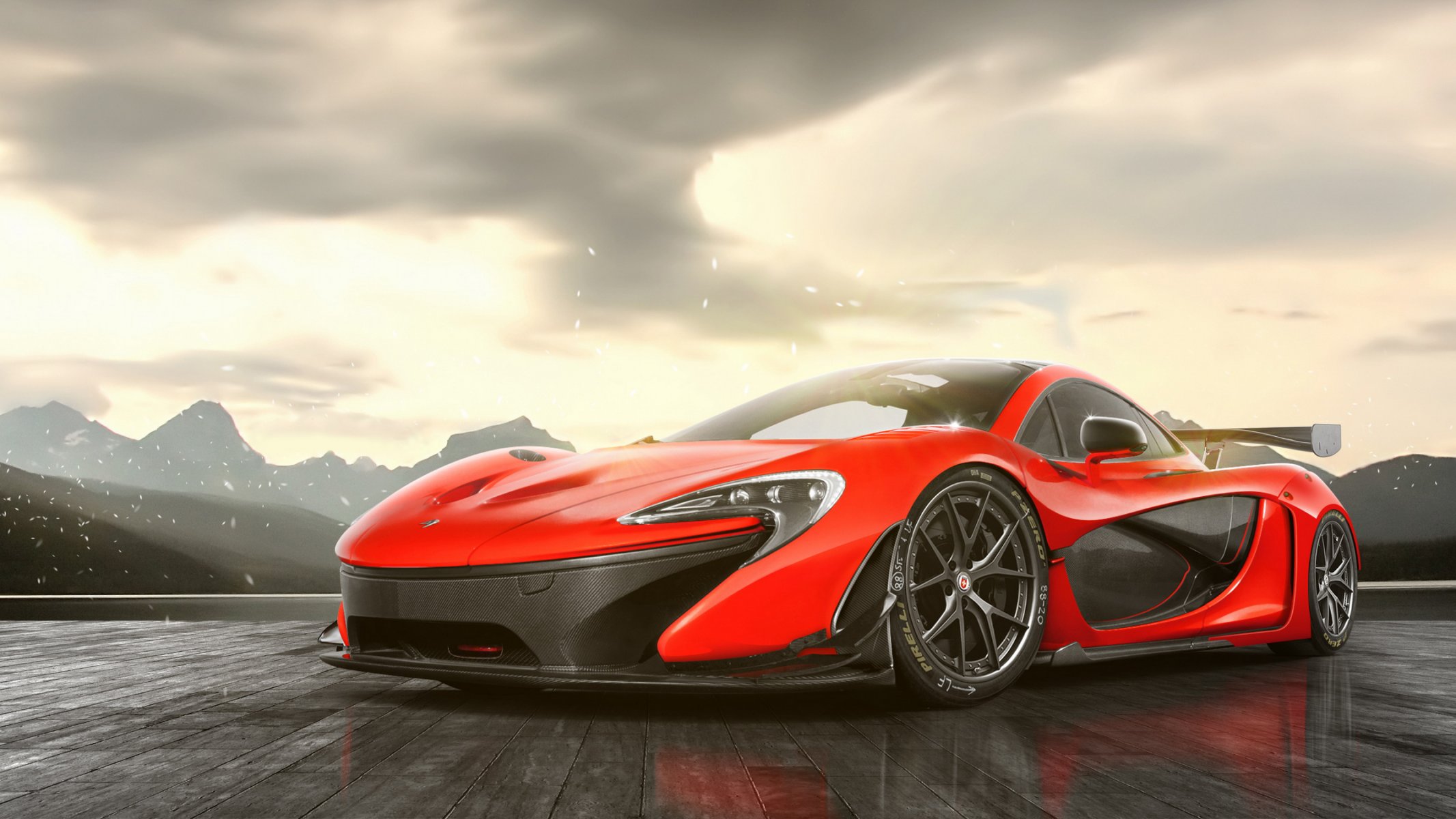 Czerwony surercar na tle burzowego nieba