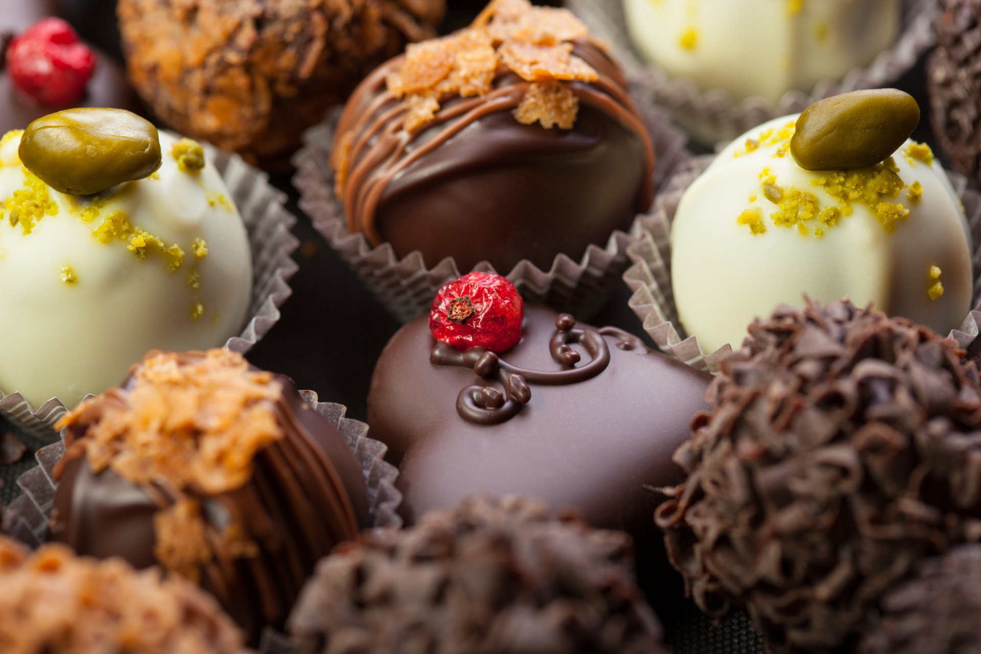 Cukierki z ciemnej czekolady ozdobione jagodami i pistacjamiCukierki z ciemnej czekolady ozdobione jagodami i pistacjami