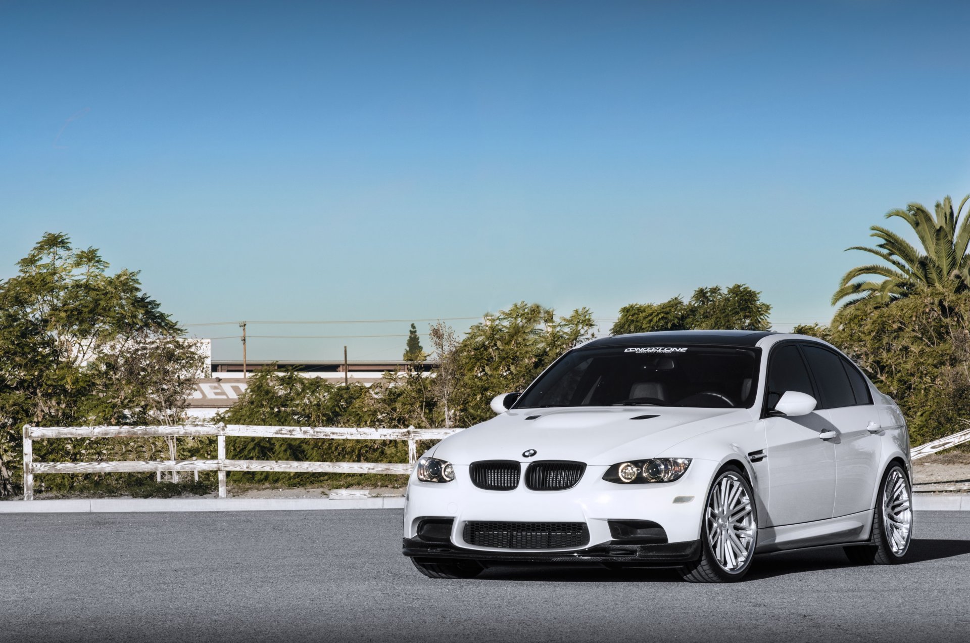 Złote tuningowane bmw m3 na tle budynków miejskichZłote tuningowane BMW M3 na tle budynków miejskich