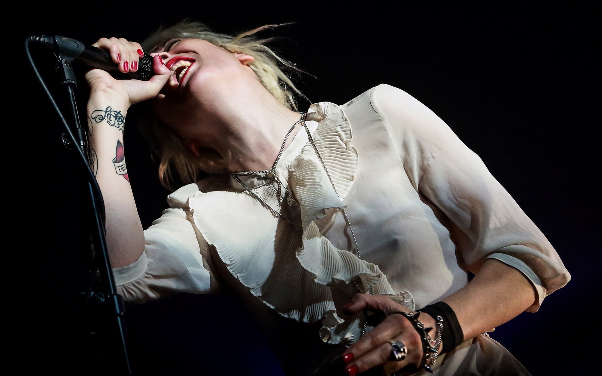 Demi mondaine śpiewa do mikrofonu na ciemnym tle
