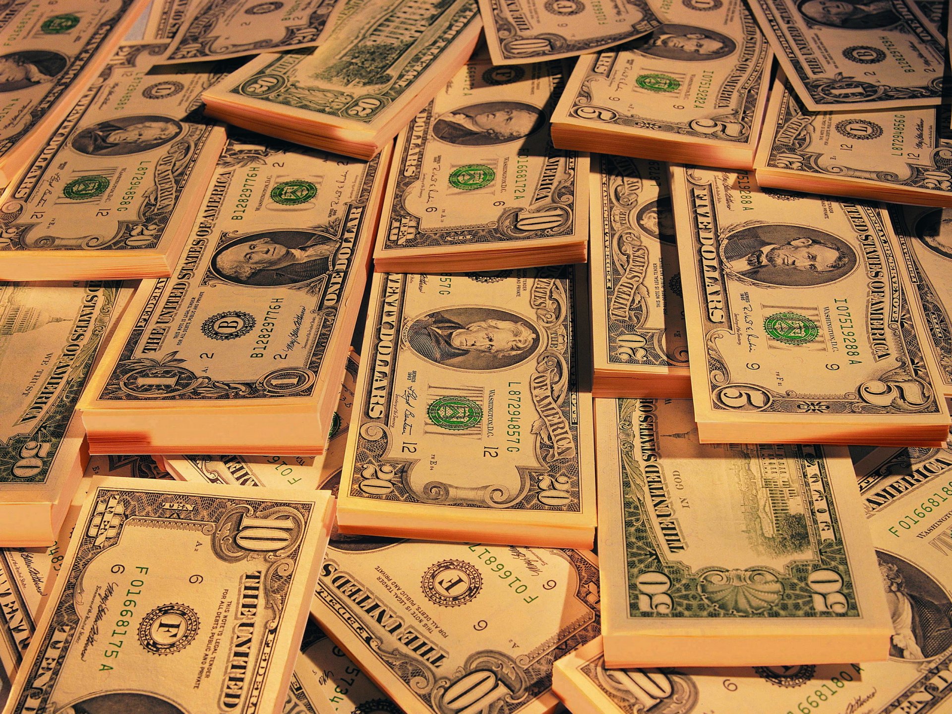 Paczki dolarów o różnych nominałach w torbie