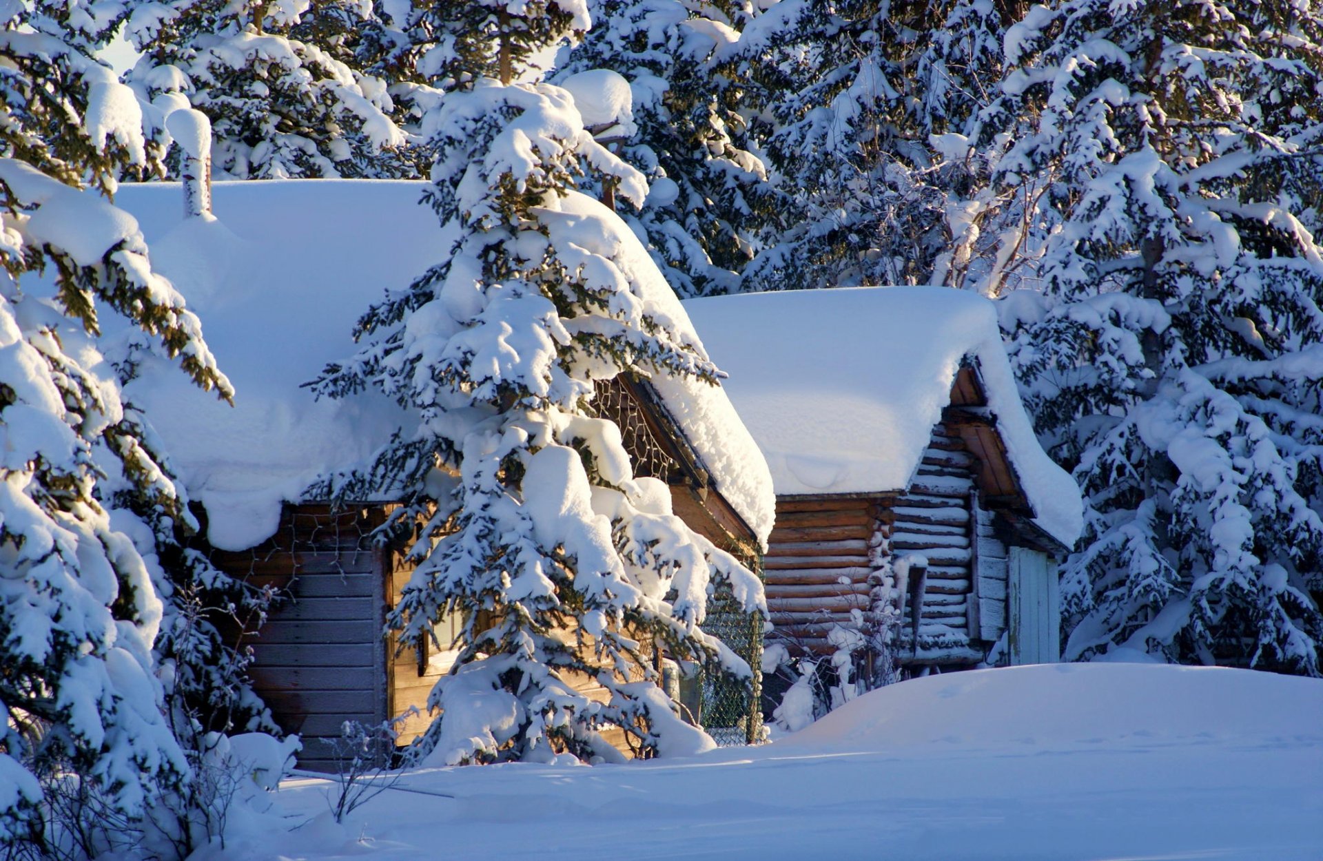 Pokryte śniegiem domki w lesie. Jedli w śniegu
