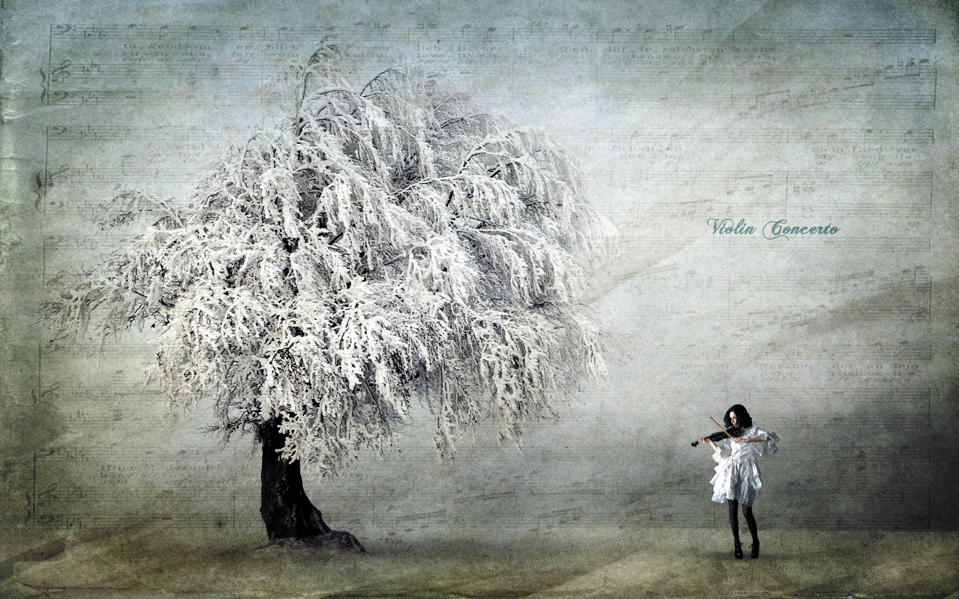 Dziewczyna ze skrzypcami w pobliżu drzewa