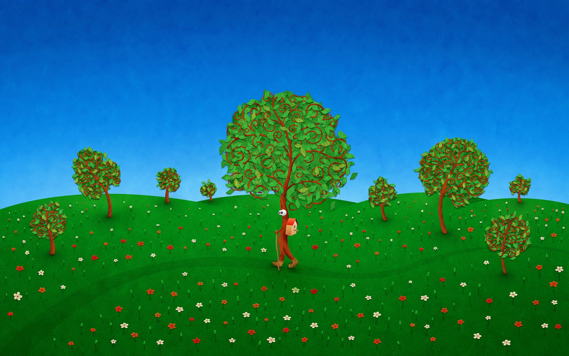 Zielone tło, zielone drzewa, domek dla ptaków na drzewie