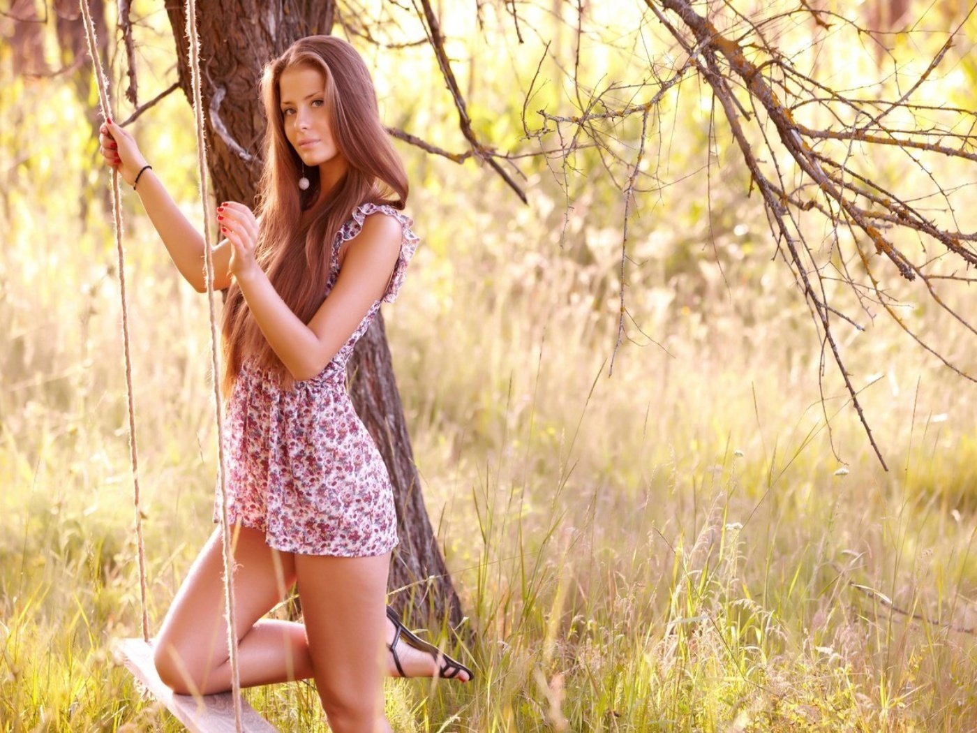 Słodka dziewczyna na łonie natury jeździ na huśtawce