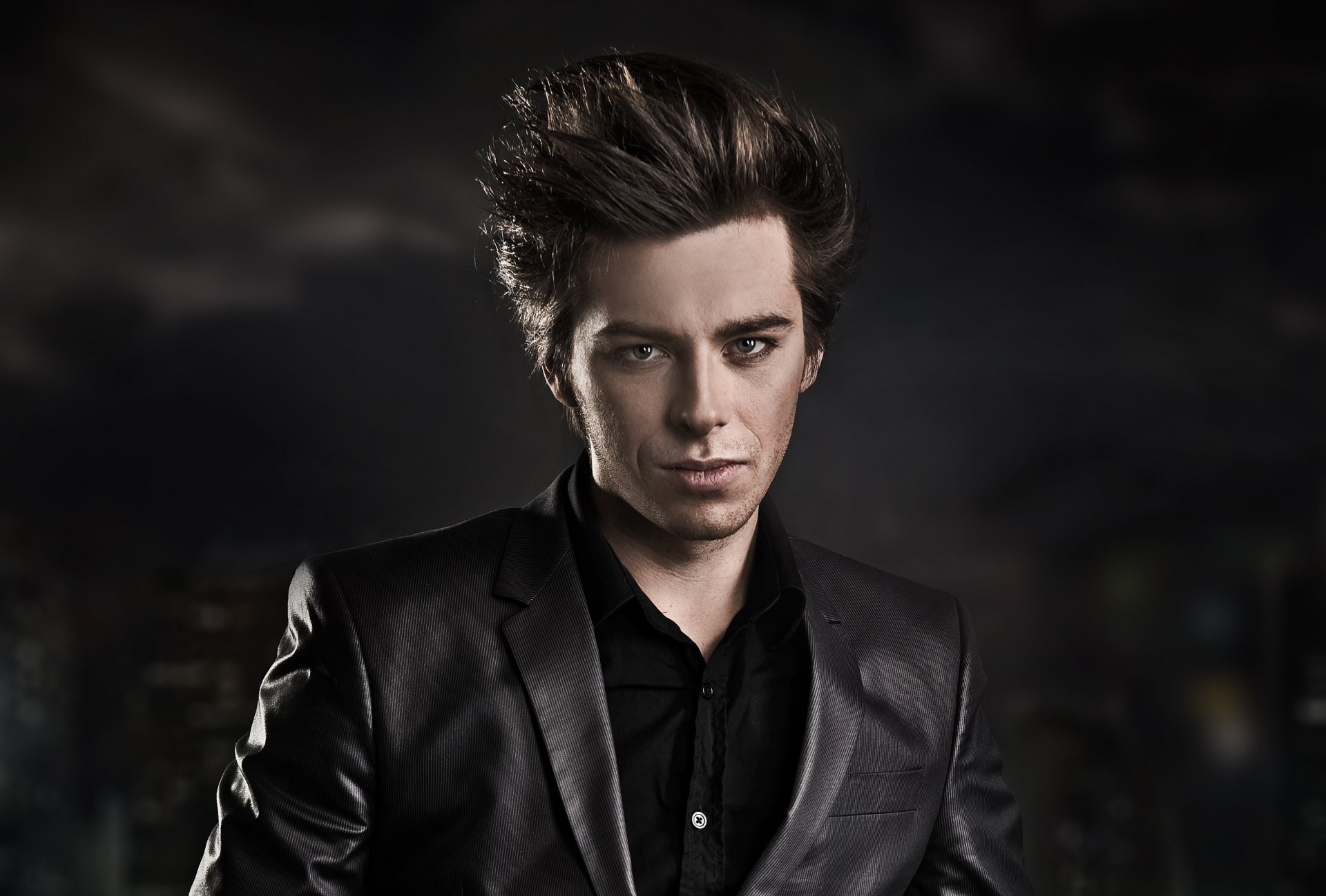 Facet w białym garniturze siedzi na stopniachgarnitur
