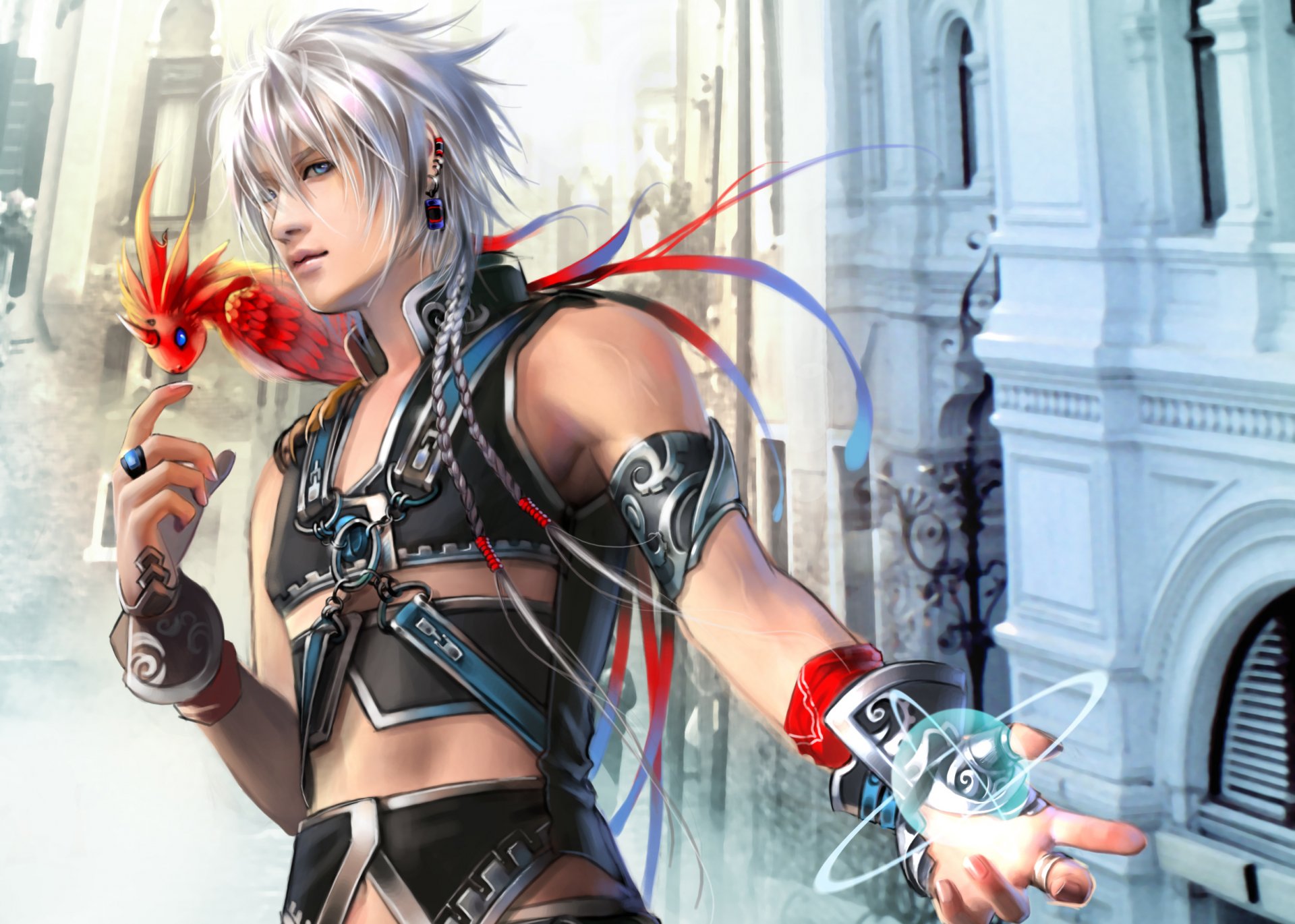 Facet z magią z ptakiem na ramieniu