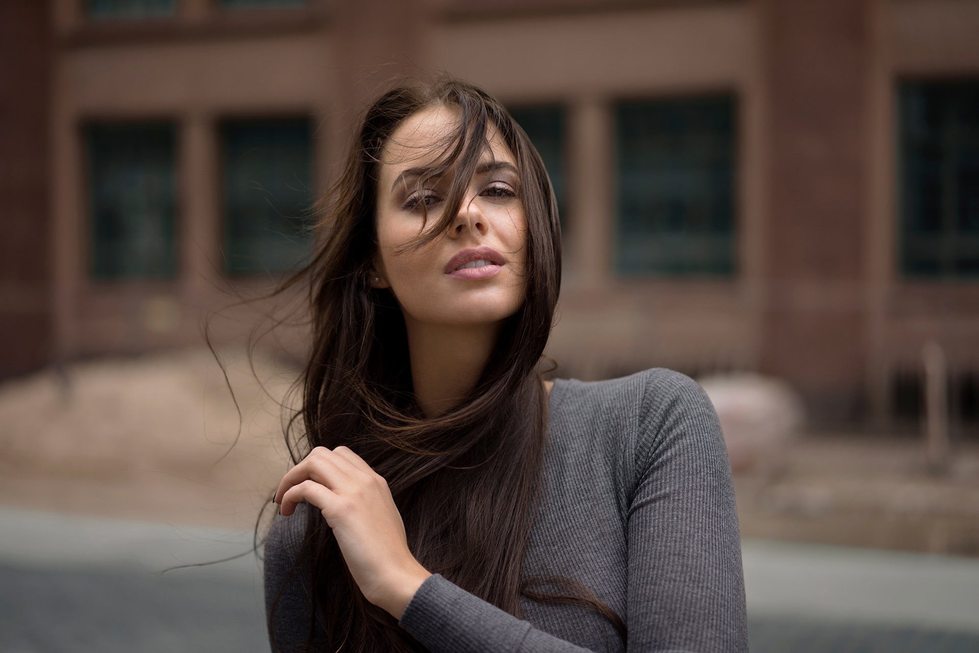 Dziewczyna pozuje na wietrze na tle budynku