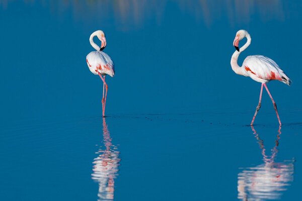 Błękitna powierzchnia jeziora odzwierciedla wspaniałe flamingi