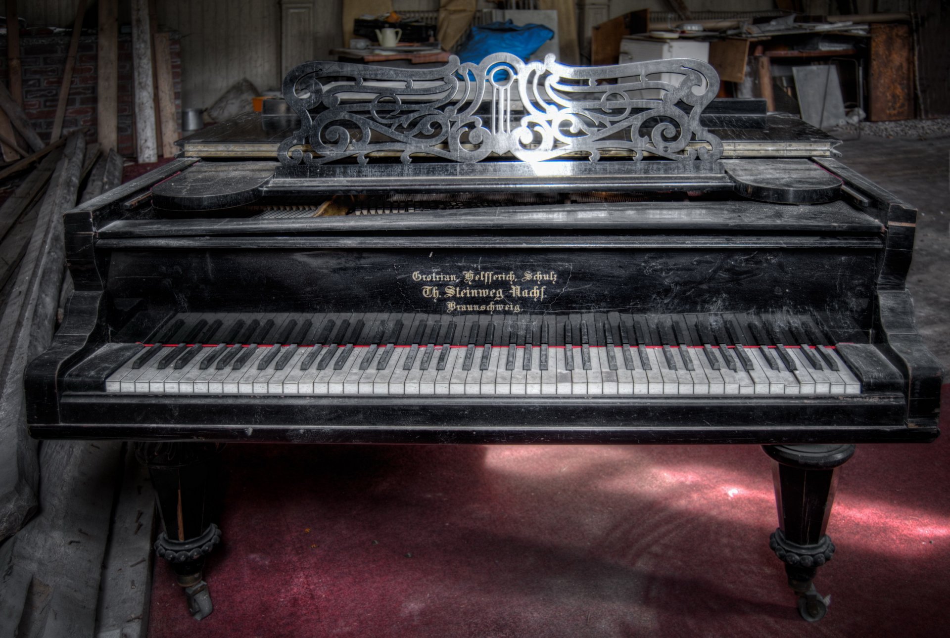 Wnętrze pokoju z fortepianem, telewizorem i sofą