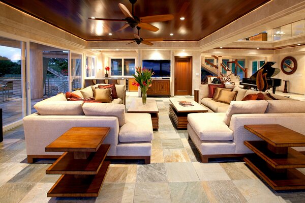 Wnętrze salonu z sofą, stołem, stolikiem nocnym i telewizorem