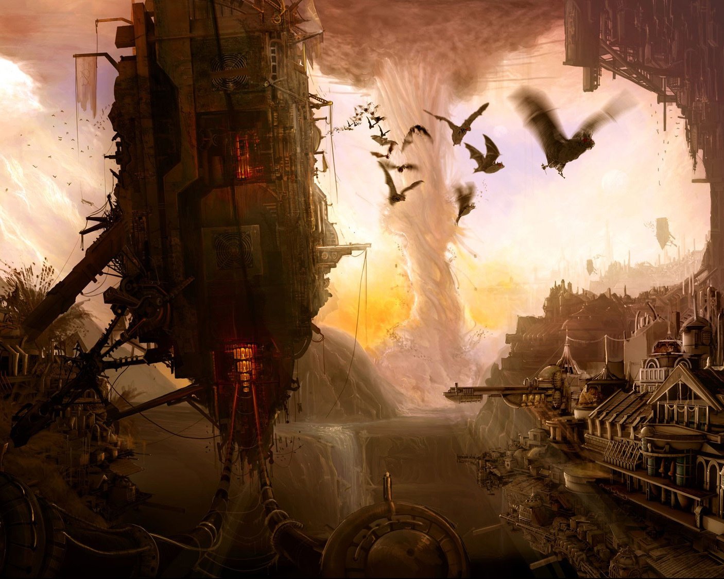 Opuszczone miasto w zniszczeniach i słonecznej mgleOpuszczone miasto w zniszczeniach i słonecznej mgle